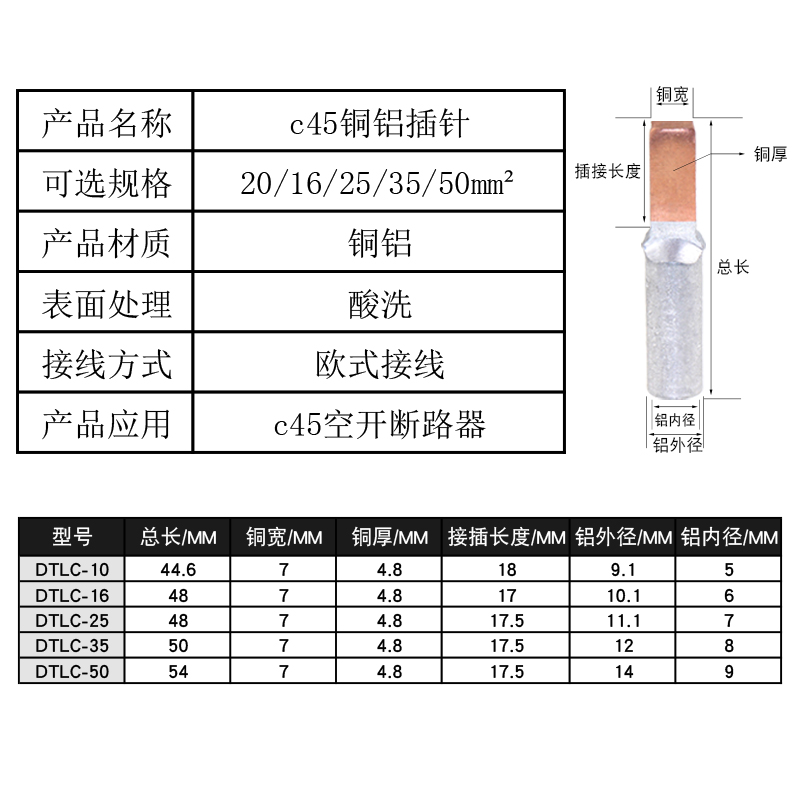 DTLC-10 Copper Aluminum Nose Cold Press Terminal Copper Aluminum Transition Wiring Nose C45 Breaker Joint Small Black Clip 10 squared