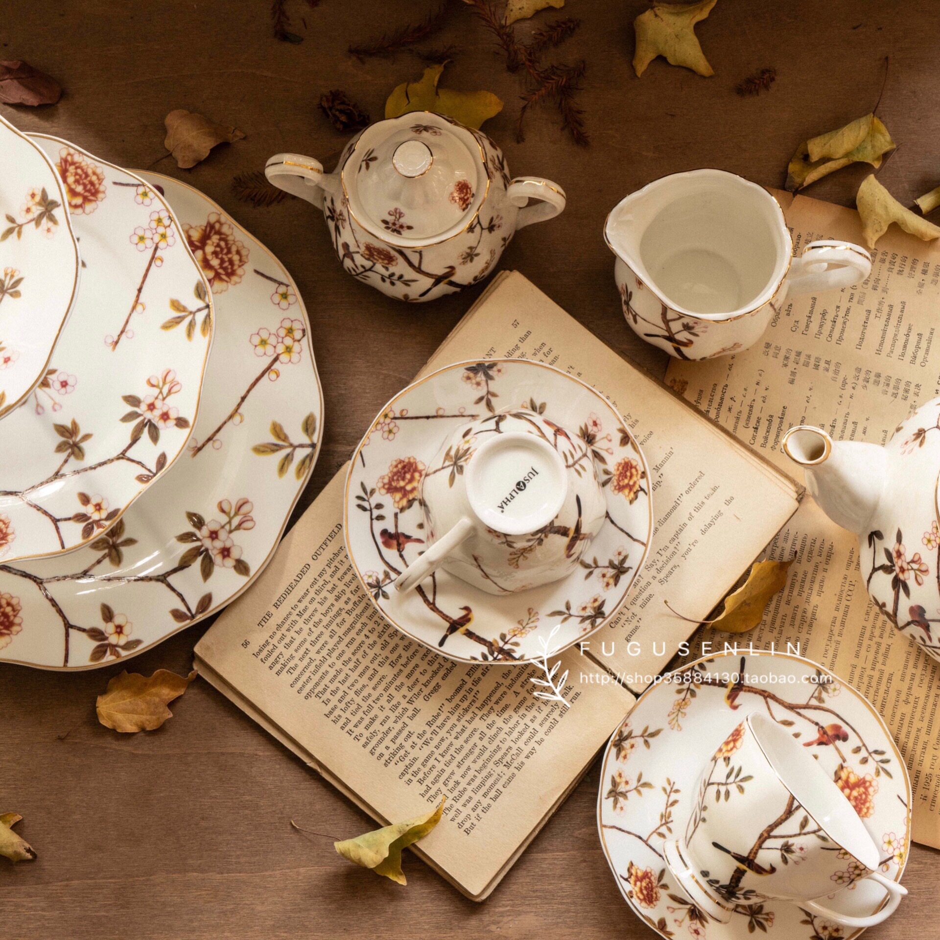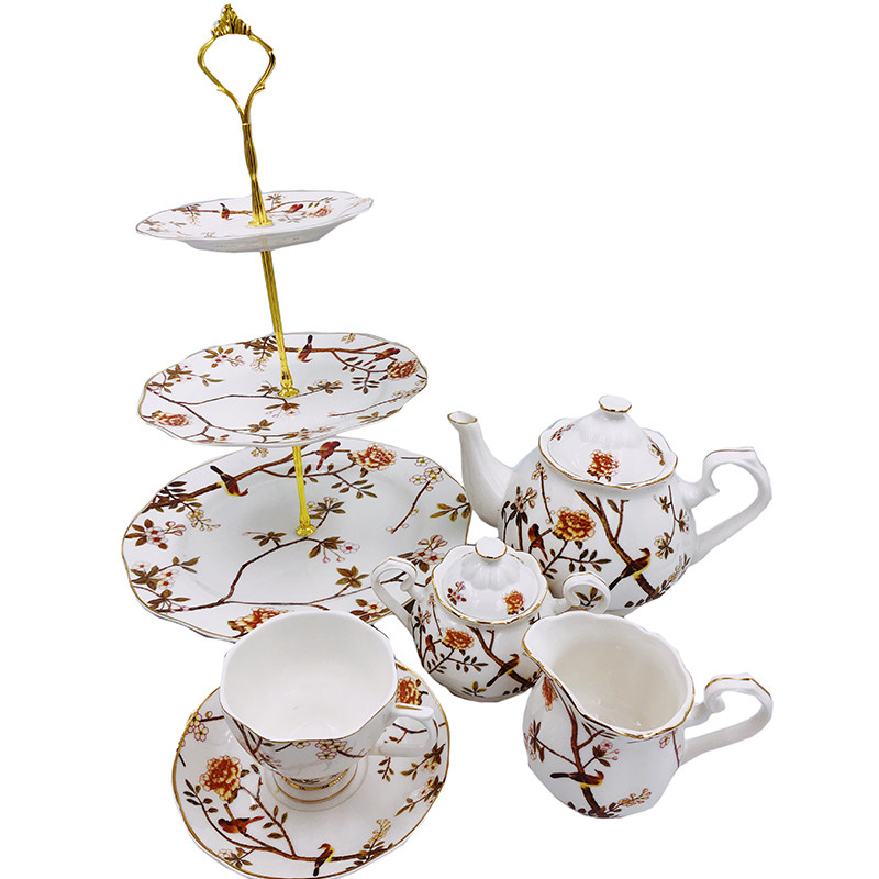 A large pot, a cup and saucer, a milk tank, a sugar pot, a 3-layer skewer, a two-cup saucer, a pot, two cups and saucers, a pot, a cylinder, a can, and a bunch of plates