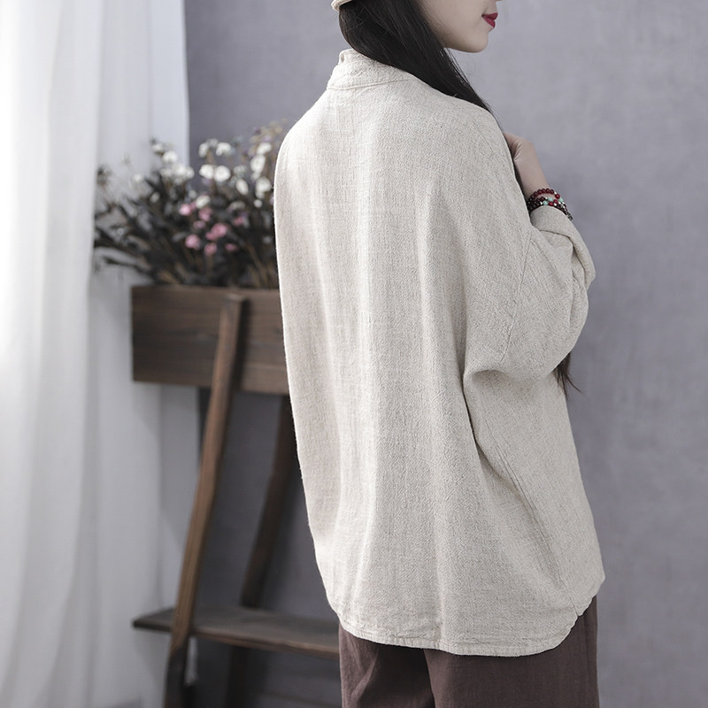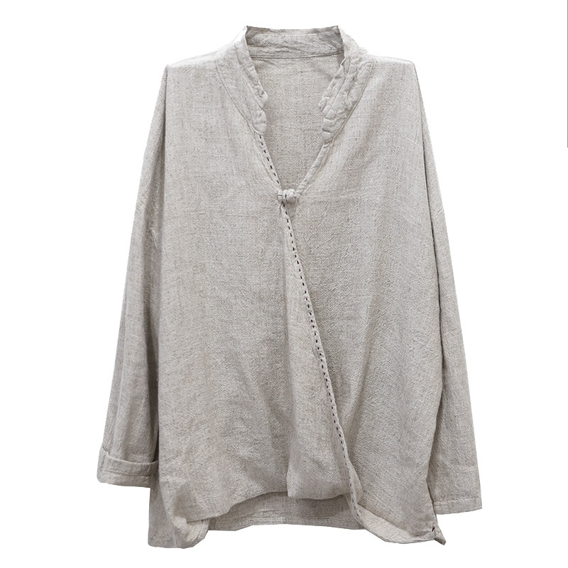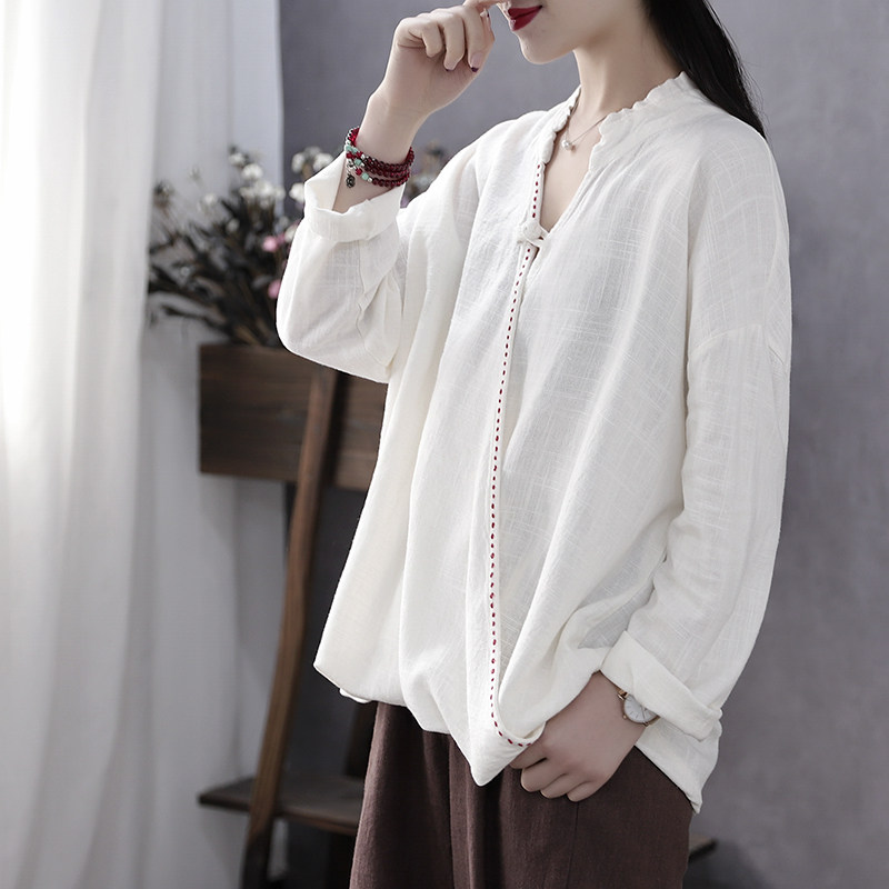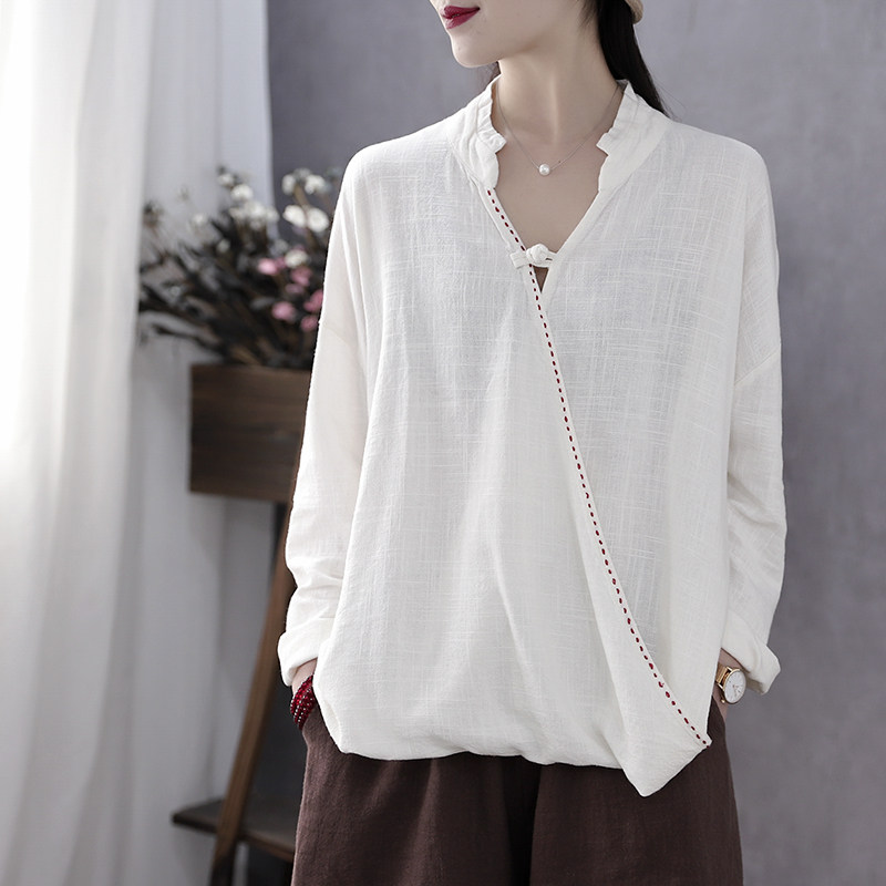 Han Soyi Retro Art Spring Autumn Season New V-collar disc buckle irregular cotton linen blouse women long sleeve hemp cotton T-shirt