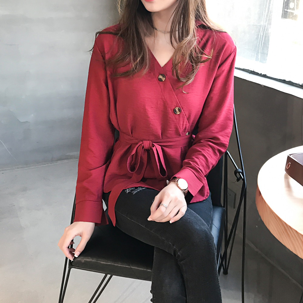 2022 Spring loaded with new body Han version net red 100 lap V neckline with diagonal fastening lacing long sleeves Slim Shirt Woman Blouse