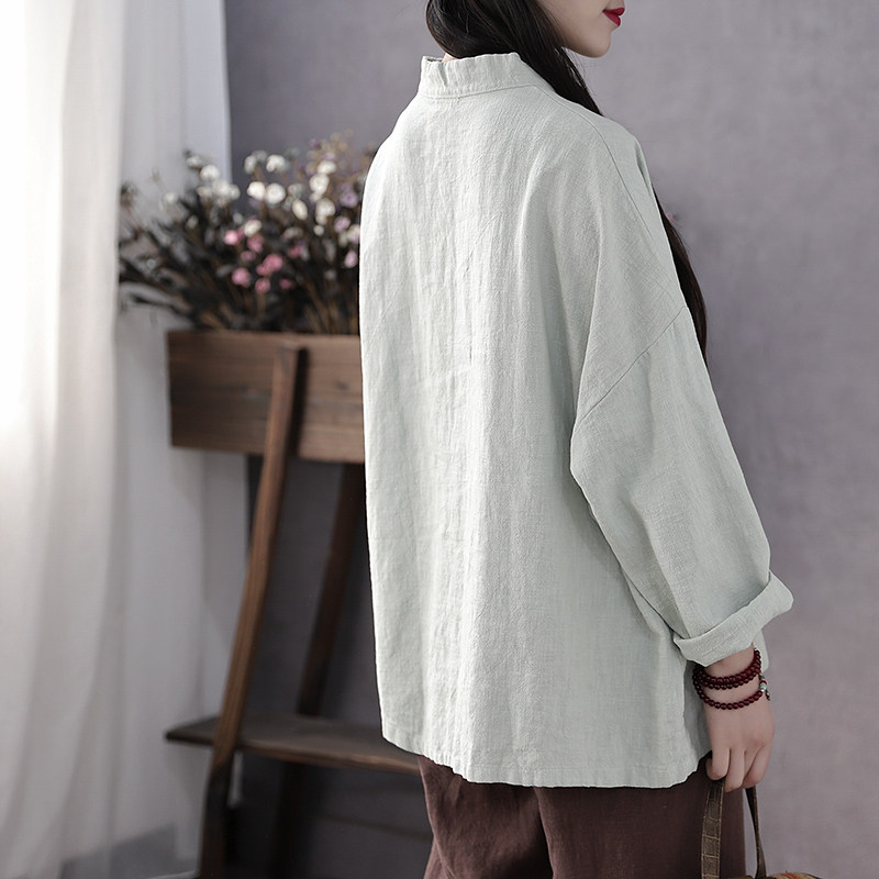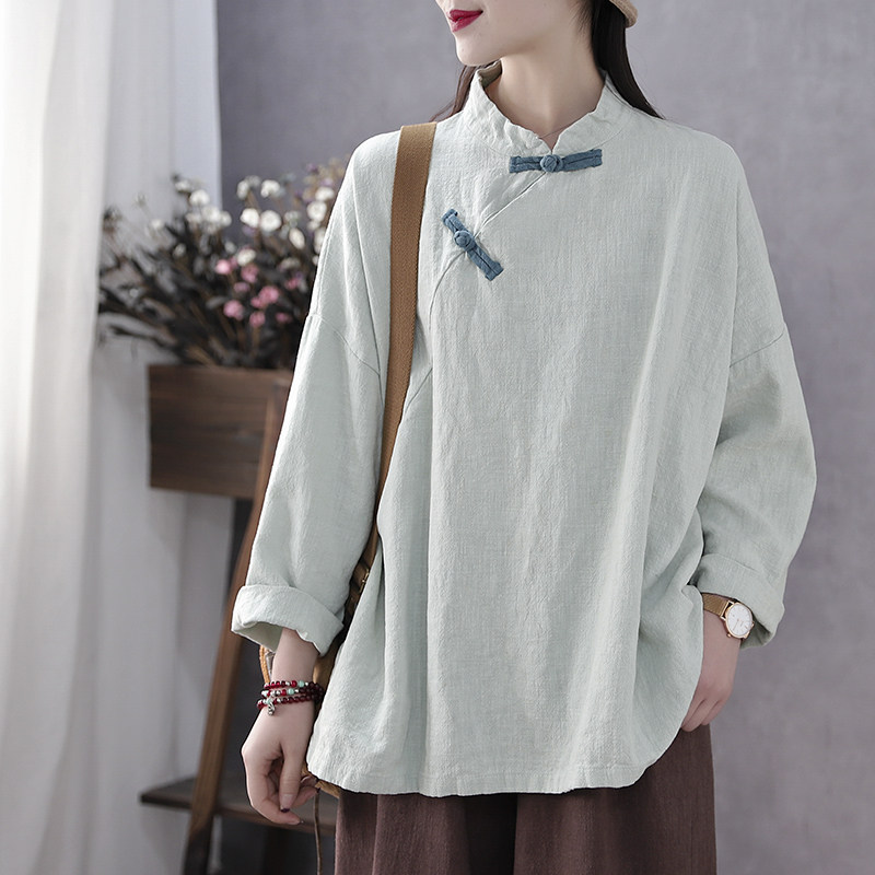 Han Suoyi literary retro spring and autumn loose round neck cotton linen long-sleeved pullover button T-shirt women's ethnic style top