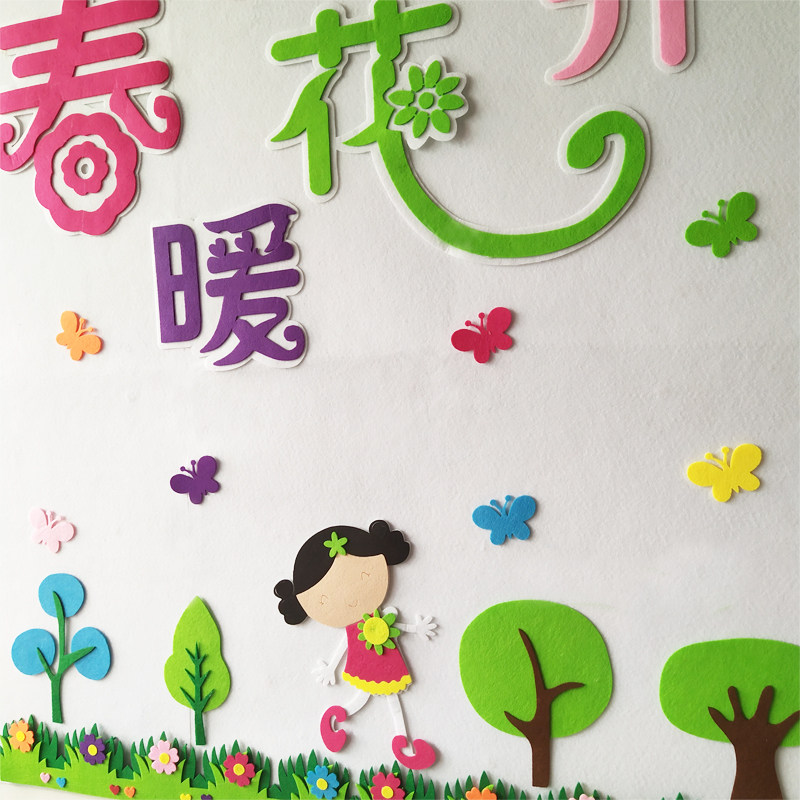 Primary school classroom environment layout theme blackboard newspaper wall paste stereo slogan spring flowers spring campus decoration