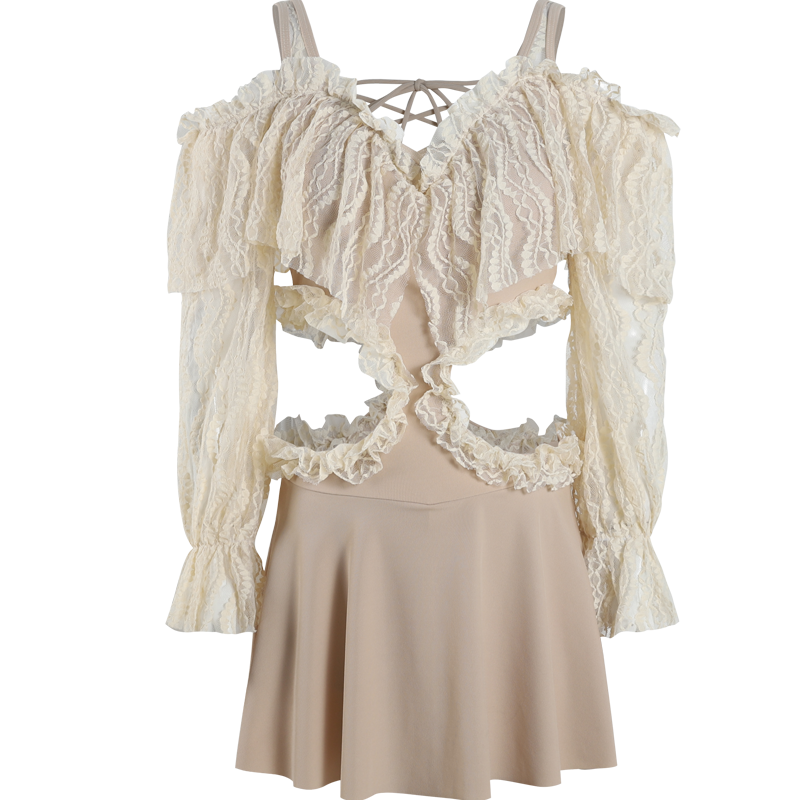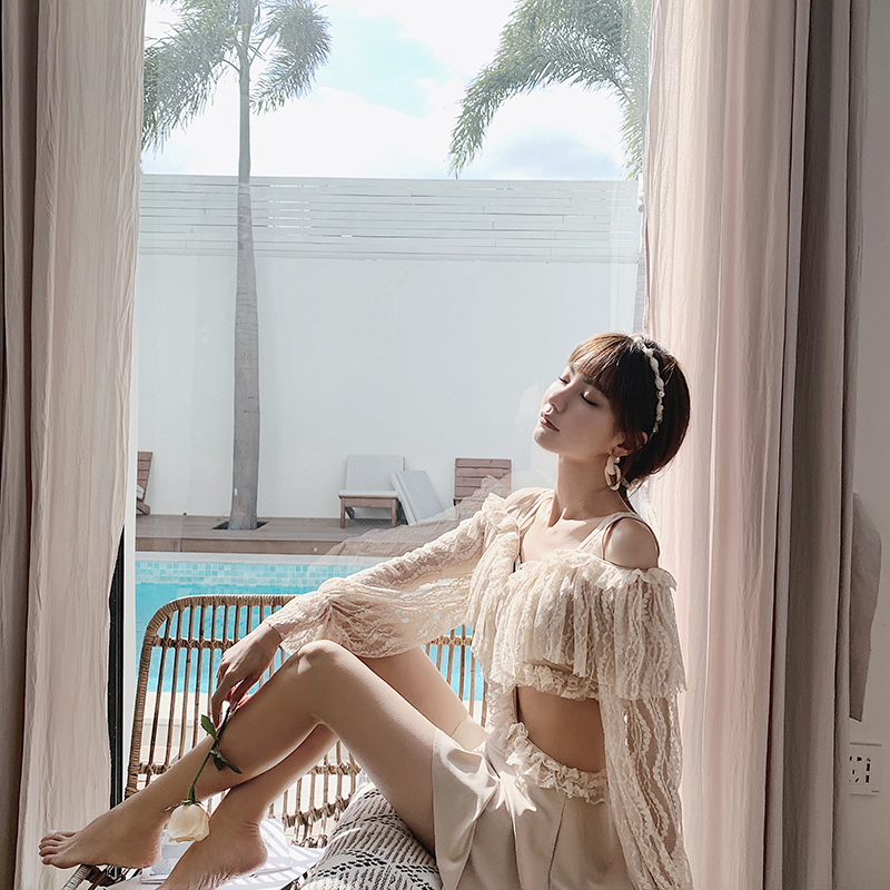 Bathing suit Female fairy fan ins lace thin belly cover small chest Conservative long-sleeved spa resort skirt bathing suit