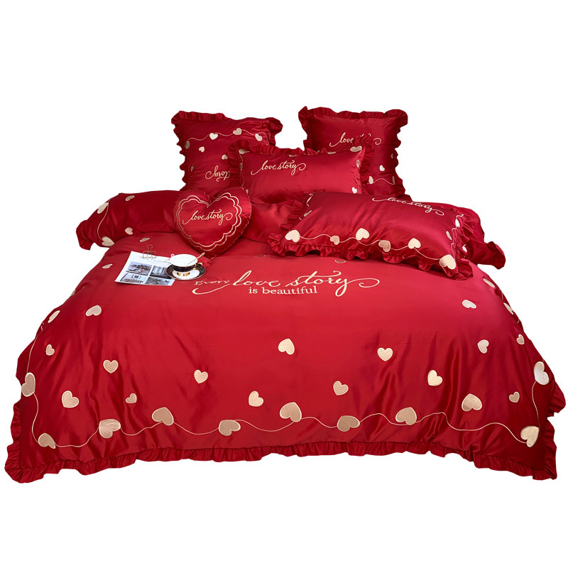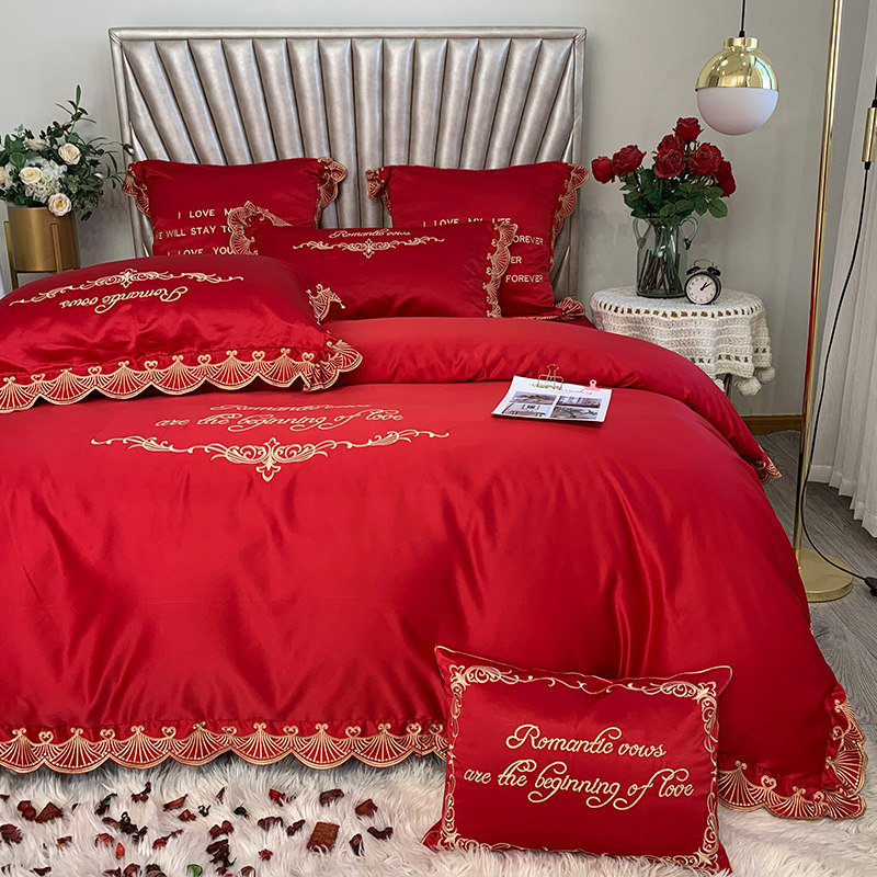 Eurostyle Upscale New Wedding Celebration Big Red Bed Four Pieces Full Cotton Pure Cotton Linen Embroidery Quilt Cover Wedding house Supplies