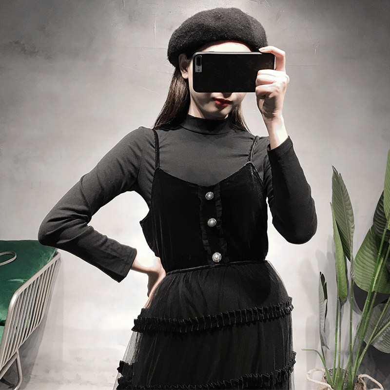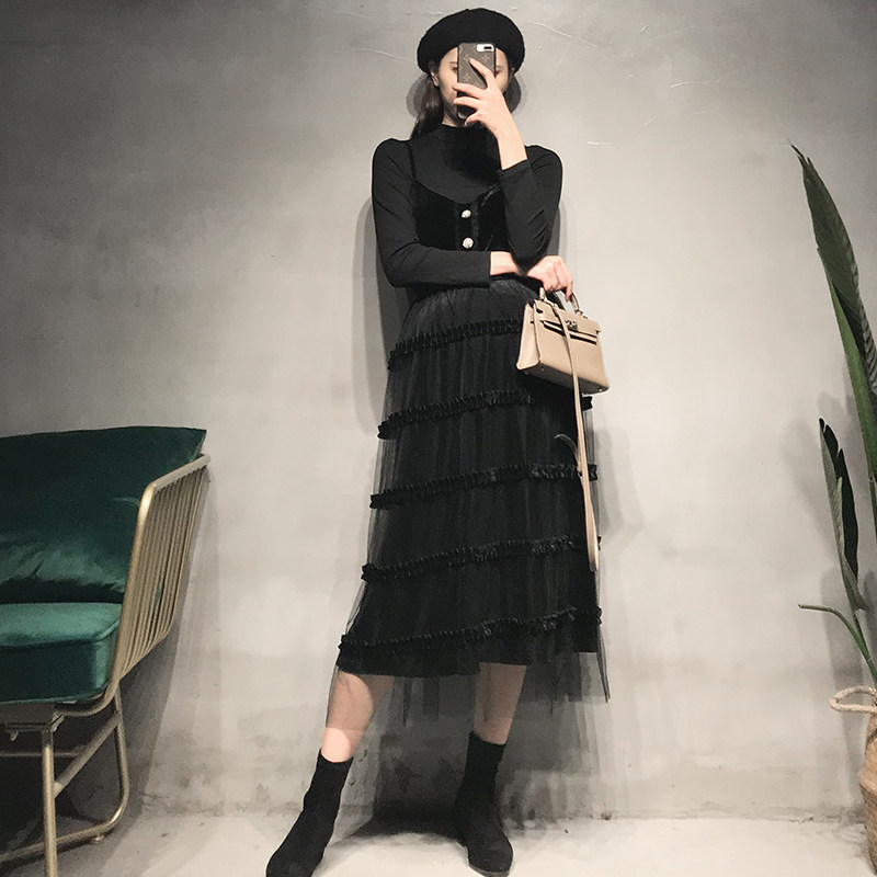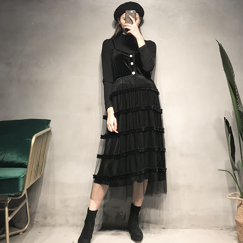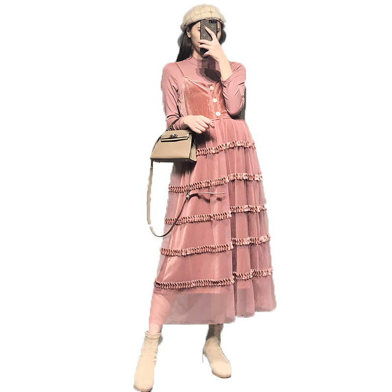 Fall Pregnant Woman Foreign Dress Trendy Chic Velvet Splicing Mesh Yarn Cake Dress Foreign Palate Long Version Harness Long Skirt Suit
