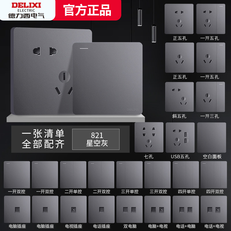 Delixi gray switch socket panel tempered glass porous home wall type brushed starry sky gray five-hole switch