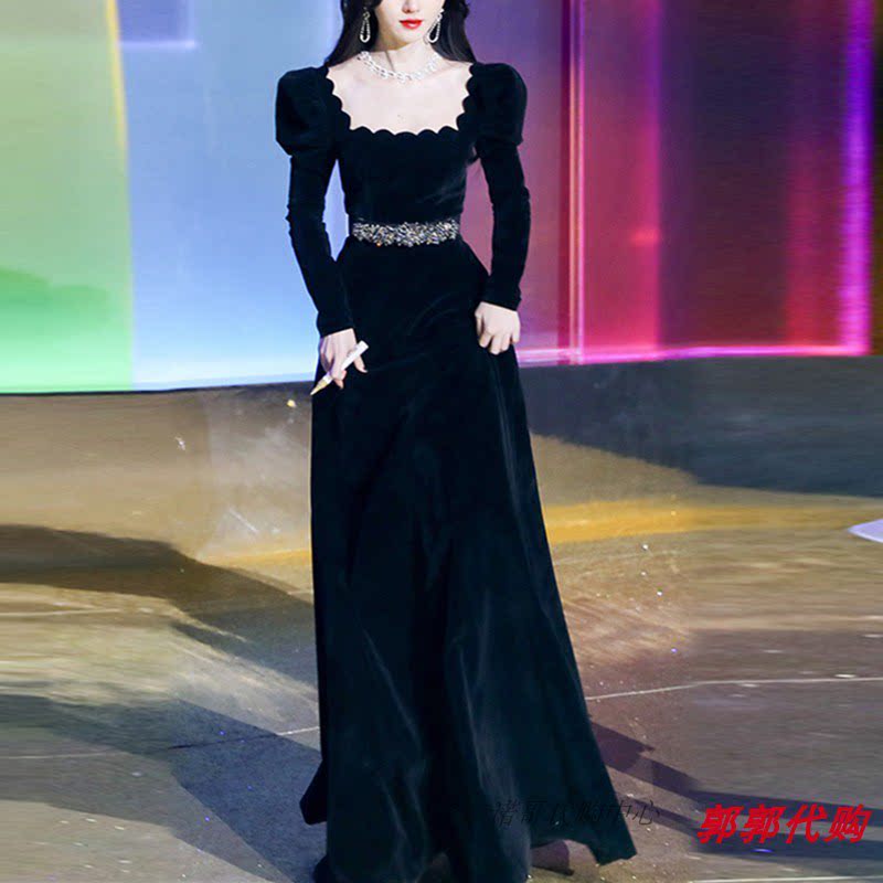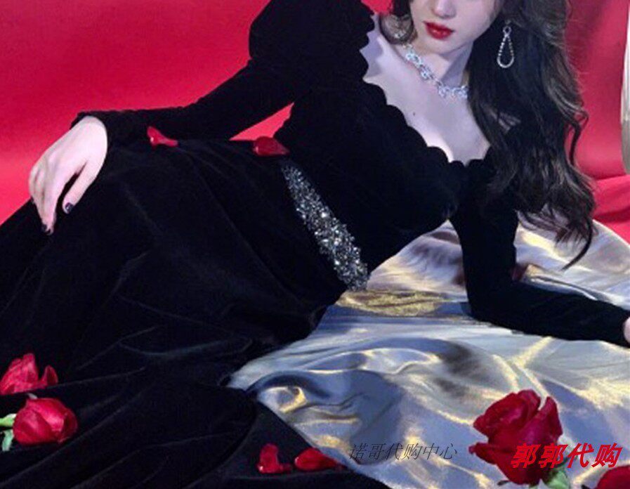 Bow Qian Yi stars the same style with autumn and winter retro palace wines sexy gown with long version of bubble sleeves Slim Velvet Dress