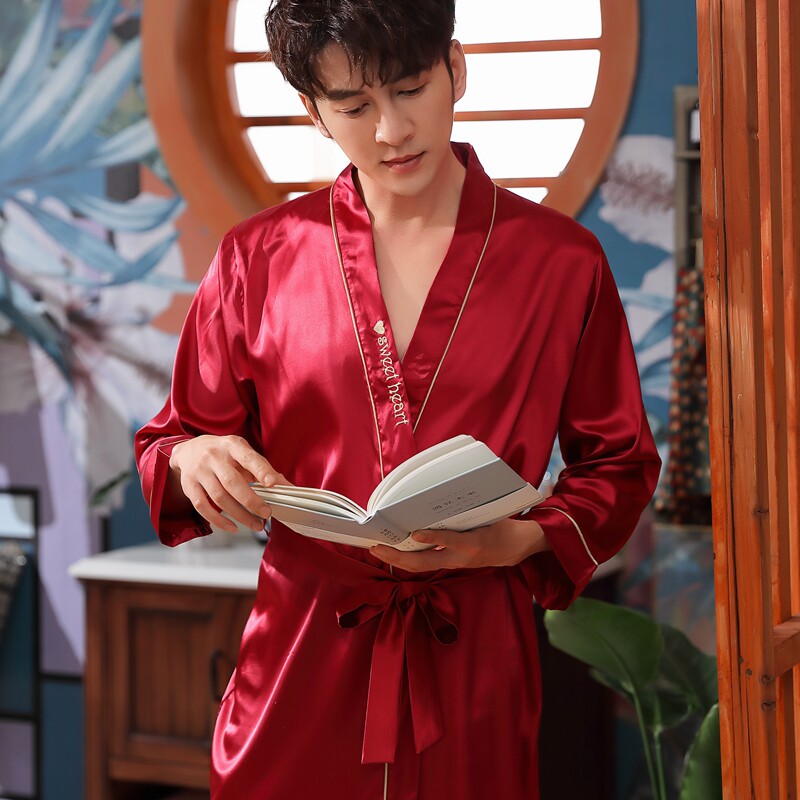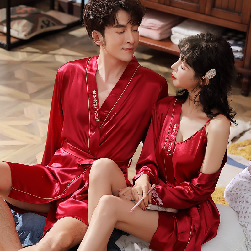Couple pajamas wedding spring and autumn red bridal dressing gown wedding gown female ice silk long-sleeved wedding suit summer