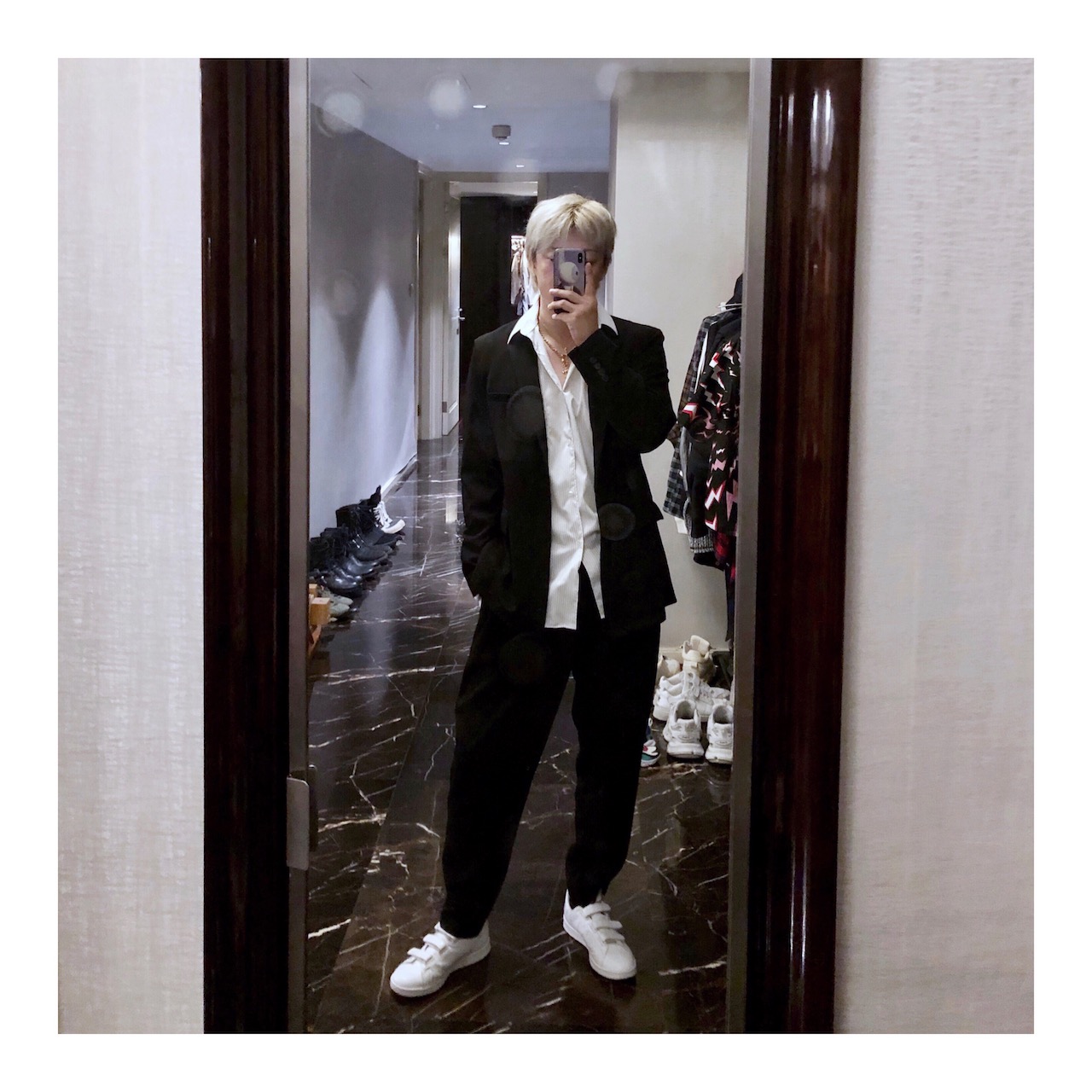 The dark blouses suit the suit.