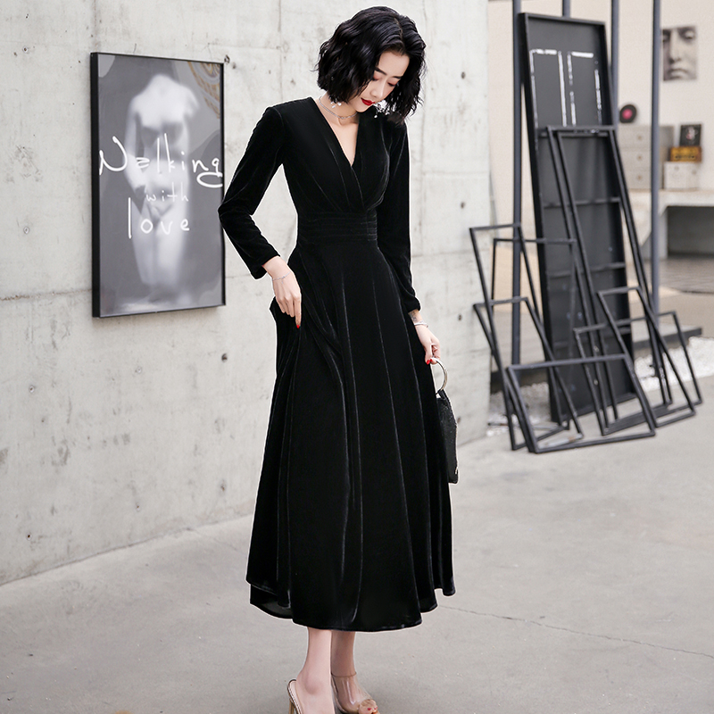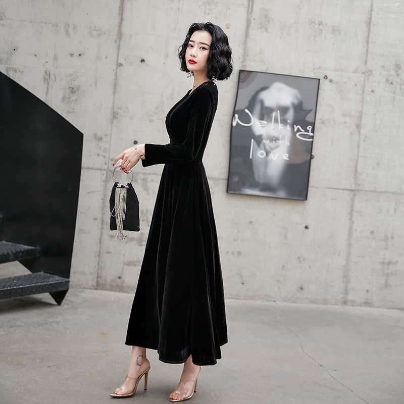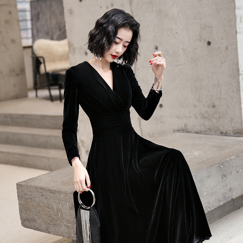 Black Evening Gown Women's Annual Conference Banquet Temperament New Host Gown Gown Velvet Long Sleeve Foreign Dress