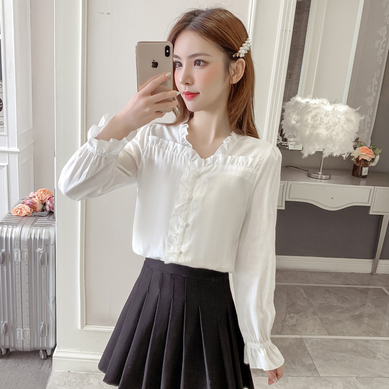Long sleeve shirt woman 2022 spring dress new V collar wood slalom shirt student little fresher horn sleeve blouse