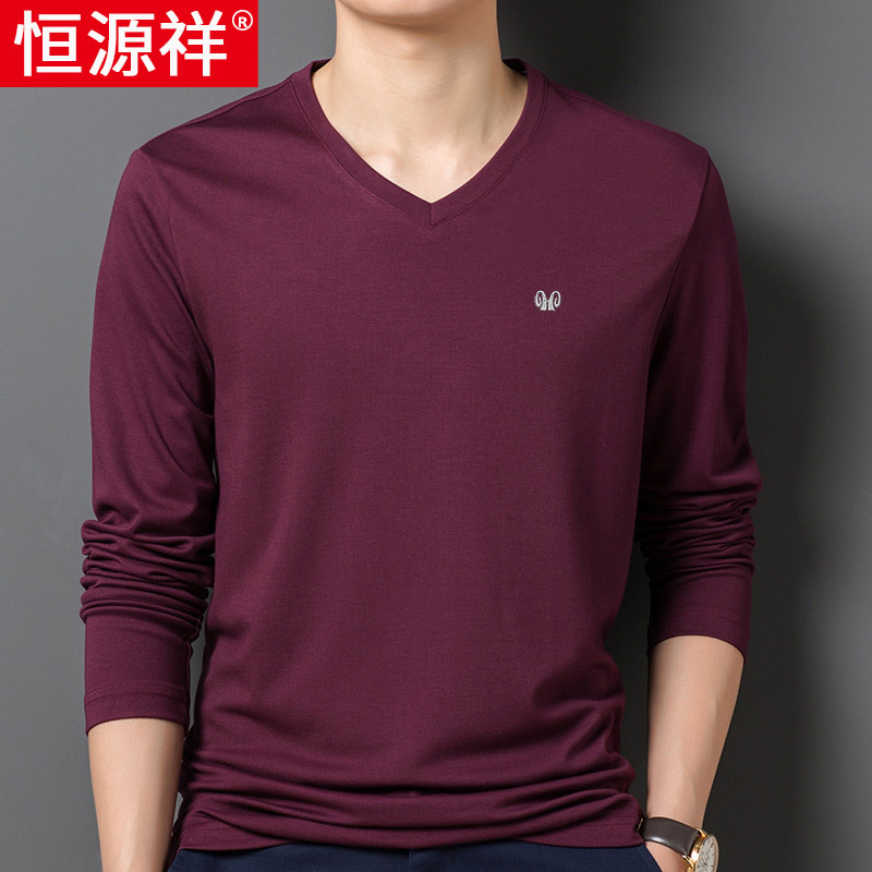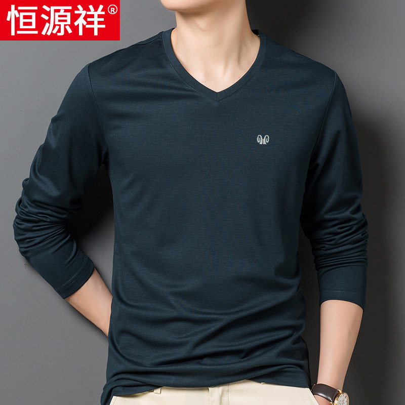 Hengyuan Xiang Man Long sleeves T-shirt Spring and autumn thin section V collar casual blouse men's pure color V collar down to bottom-shirt tide