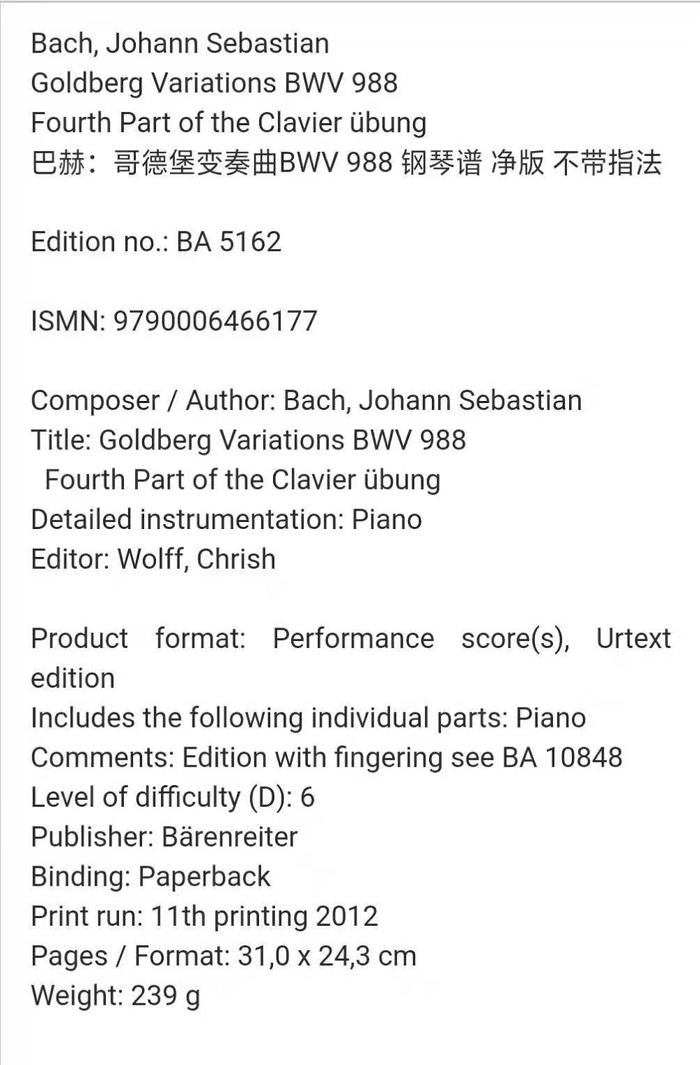 Bach Goldberg Variations BWV 988 for Solo Piano, Net Version, No Fingering, The Bear Rider, Original Score Book, Goldberg Variations Four