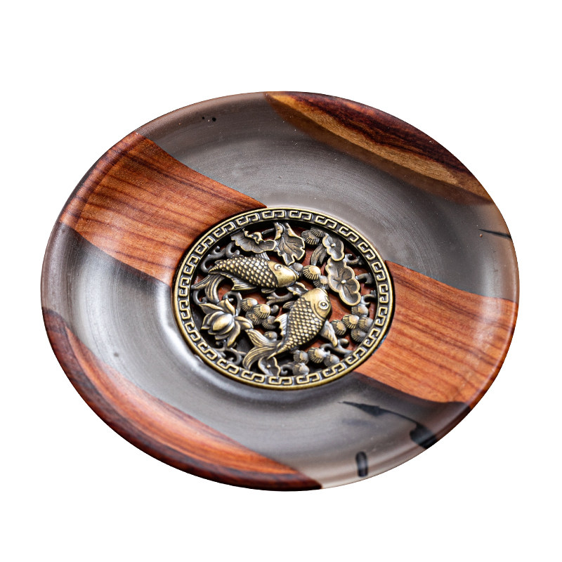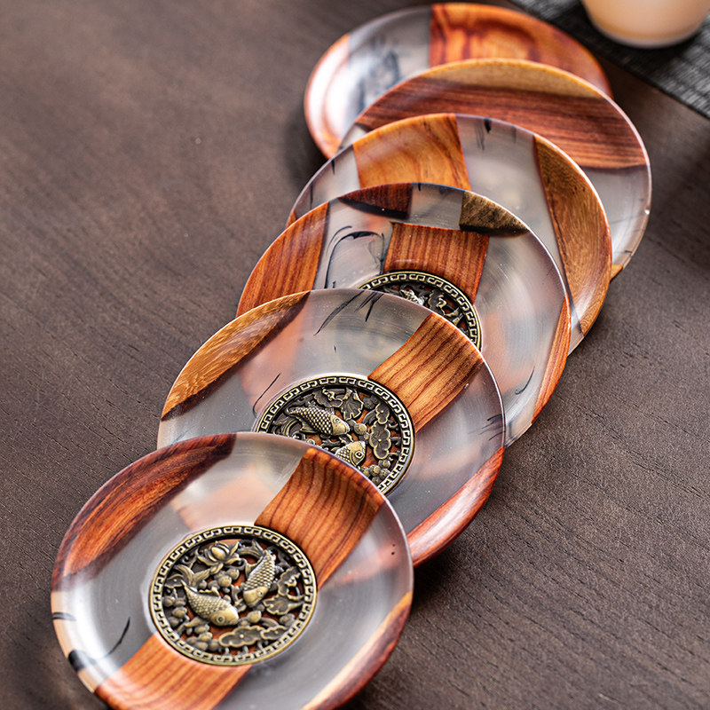 Resin Pine Wood Ink Imprint Square Cup Cushion Resin Pine Wood Brass Ink Imprint Fish Play Pool Cup Mat