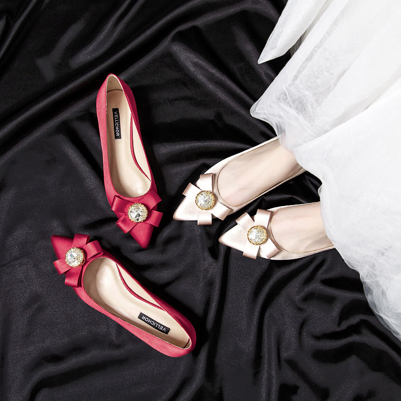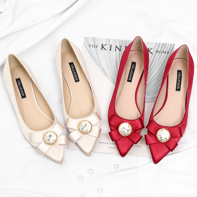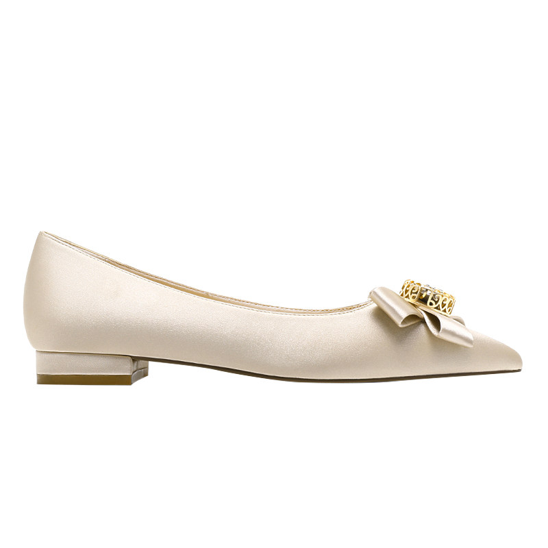 Wedding Shoes Women 2019 New Bridal Bridesmaid Show and Pointed Water Drill Butterfly Knot Low Heel Single Shoes Nude Color Flat Bottom Shoes