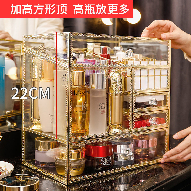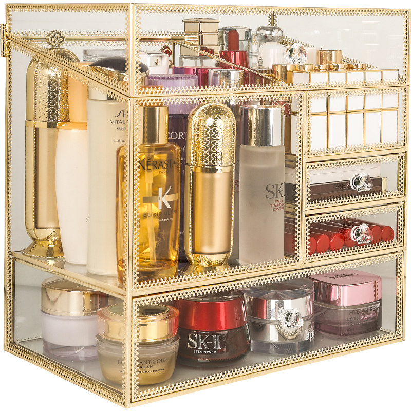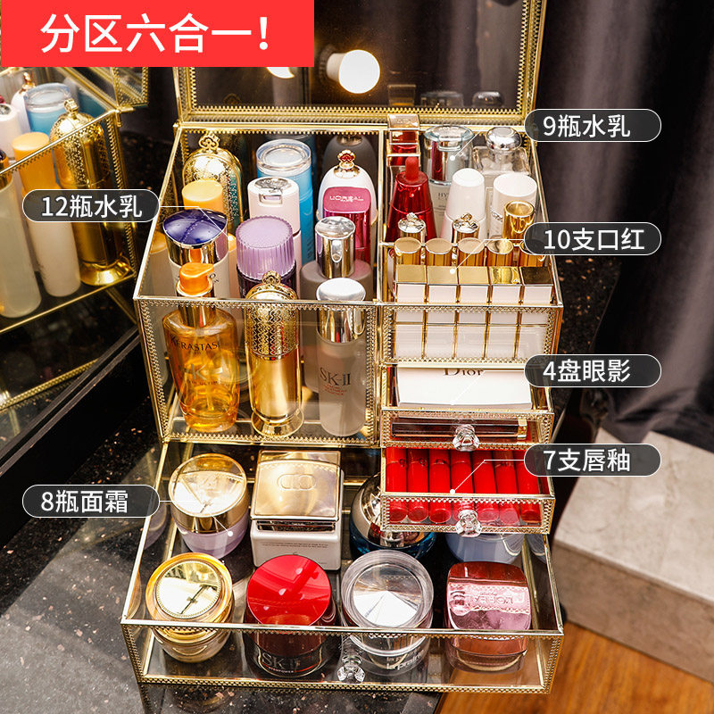 Cosmetic storage box integrated drawer type light luxury copper glass skin care products brush large capacity desktop shelf