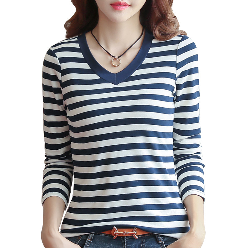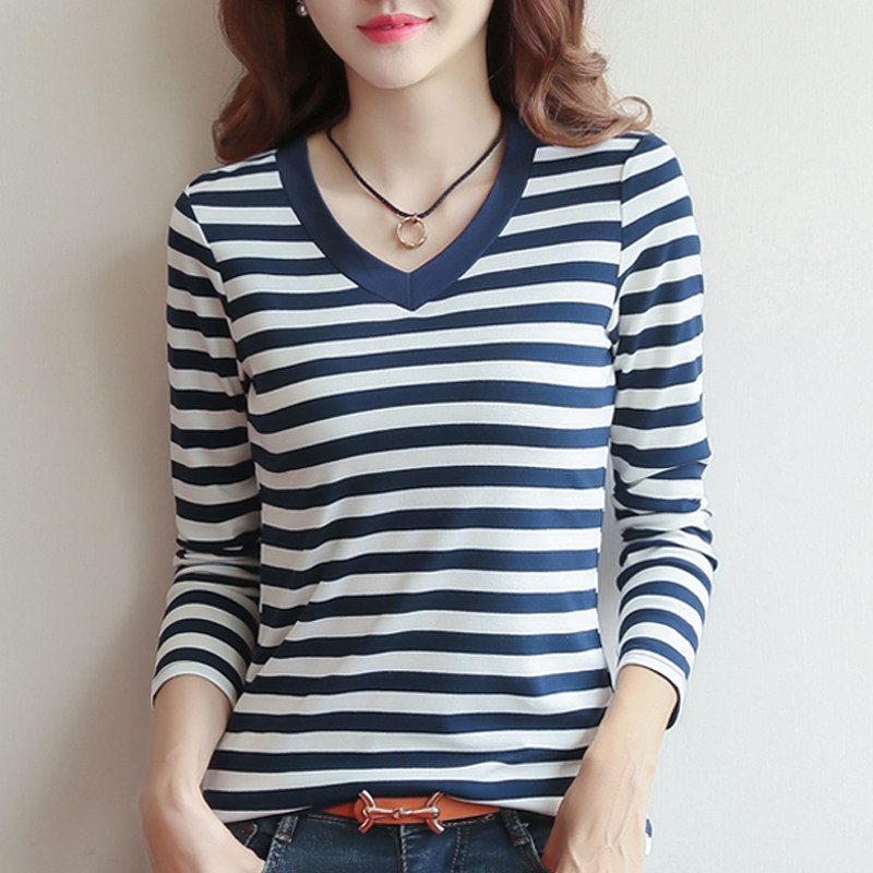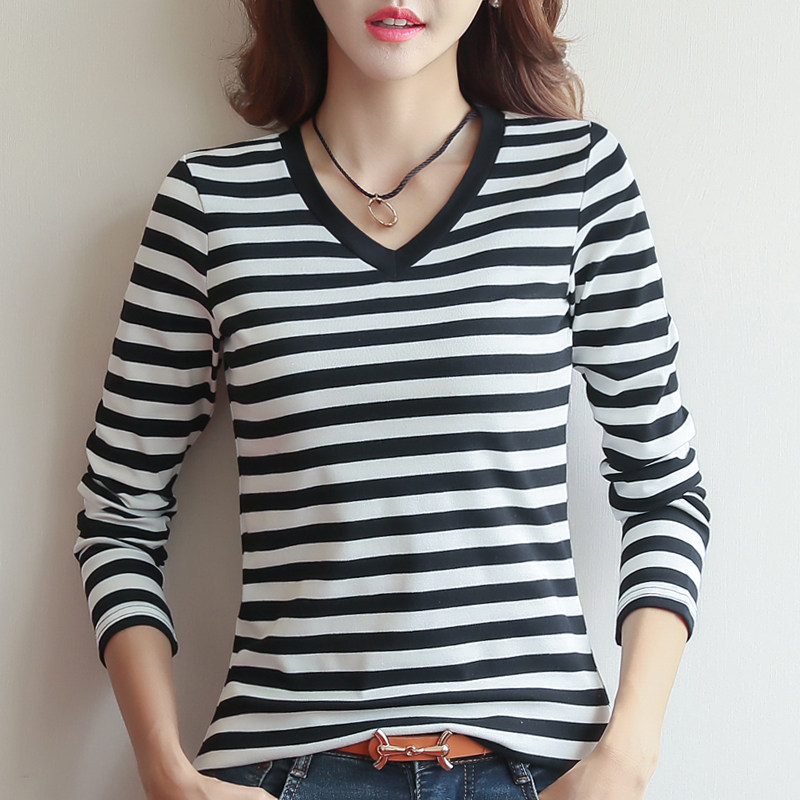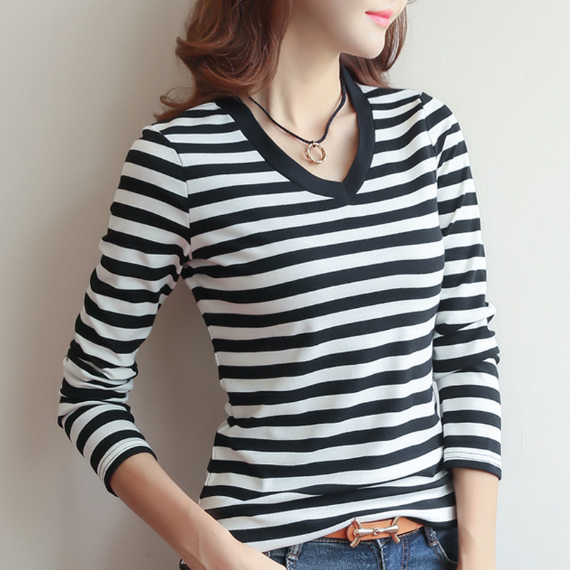 2020 new striped inner clothes women's autumn and winter long-sleeved T-shirt women's top V-neck Korean version of the black inner t-shirt