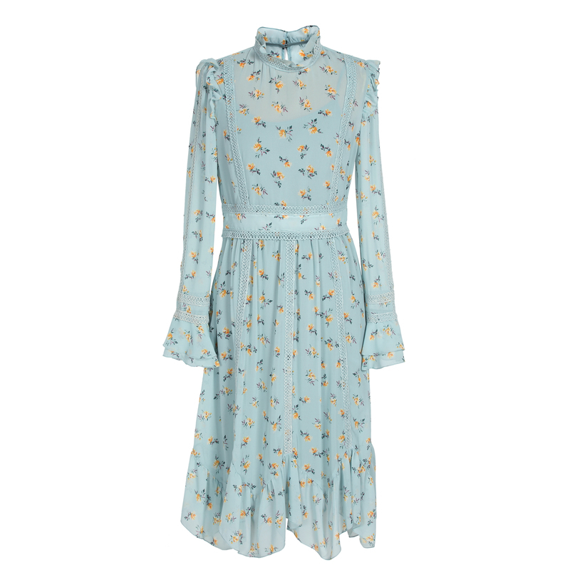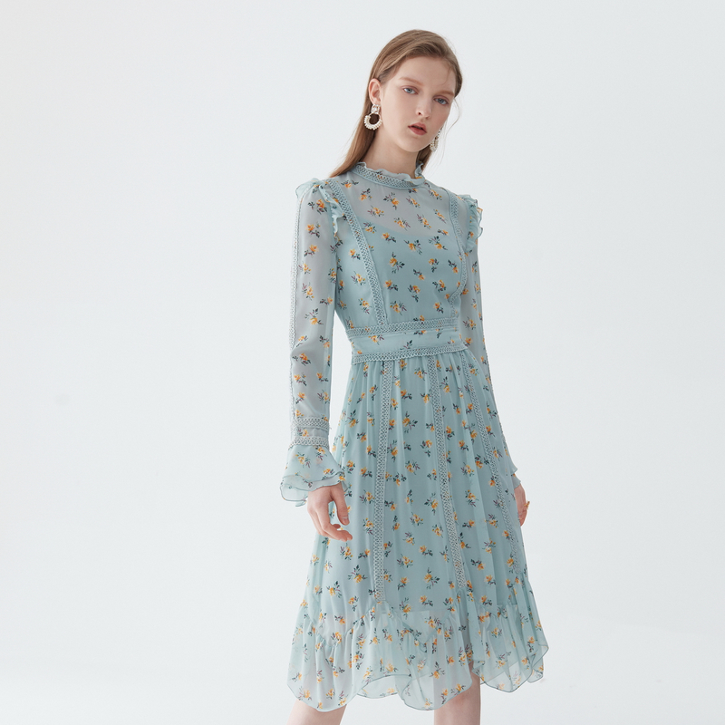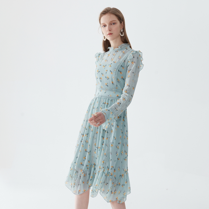 miss COCOON2022 spring and autumn new women's niche ruffles waist floral chiffon dress