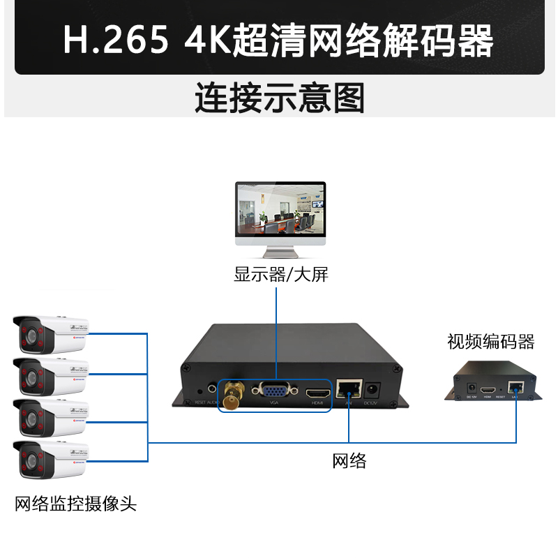 H265 4CH Network Audio and Video Decoder HDMI VGA CVBS Solution 4K Surveillance Hikvision Onvif