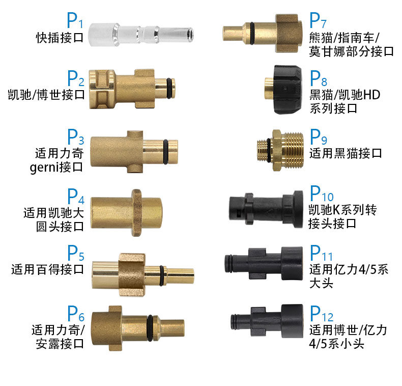 (SP1)Italian quick plug connector + quick connect female (SP2)Kärcher-Bosch small interface + coupling female (SP3)Licci gerni interface + quick coupling female (SP4)Kärcher large round head interface + quick coupling female (SP5)Baide interface + coupling female (SP6)Liqi Anlu part interface + coupling female (SP7)Panda Guide Car Interface + Quick coupling female (SP8)Black cat Kärcher HD series interface + quick coupling female (SP9)Black cat interface + quick coupling female (SP10) K-Chi K series adapter interface + coupling female (SP11)Yili 4 5 series head (commonly used) + coupling female head (SP13)Morgana No. 1 port + quick coupling female head (LP1)Italian quick connector extended coupling (LP2)Kärcher-Bosch small interface extended coupling (LP3)Liqigerni interface extended coupling (LP4)Kärcher large round head interface extended coupling (LP5)Baide interface extended coupling (LP6)Liqi Anlu part of the interface extended coupling (LP7) Panda Guide Car Interface Extended Coupling (LP8)Black Cat Kärcher HD Series Interface Extension Coupling (LP9)Black Cat Interface Extension Coupling (LP10)K-Chi K Series Adapter Interface Extension Coupling (LP11)Billion Force 4 Series 5 Greenfield (Some Models) Extended Express (LP13)Morgana No.1 Interface Extended Coupling