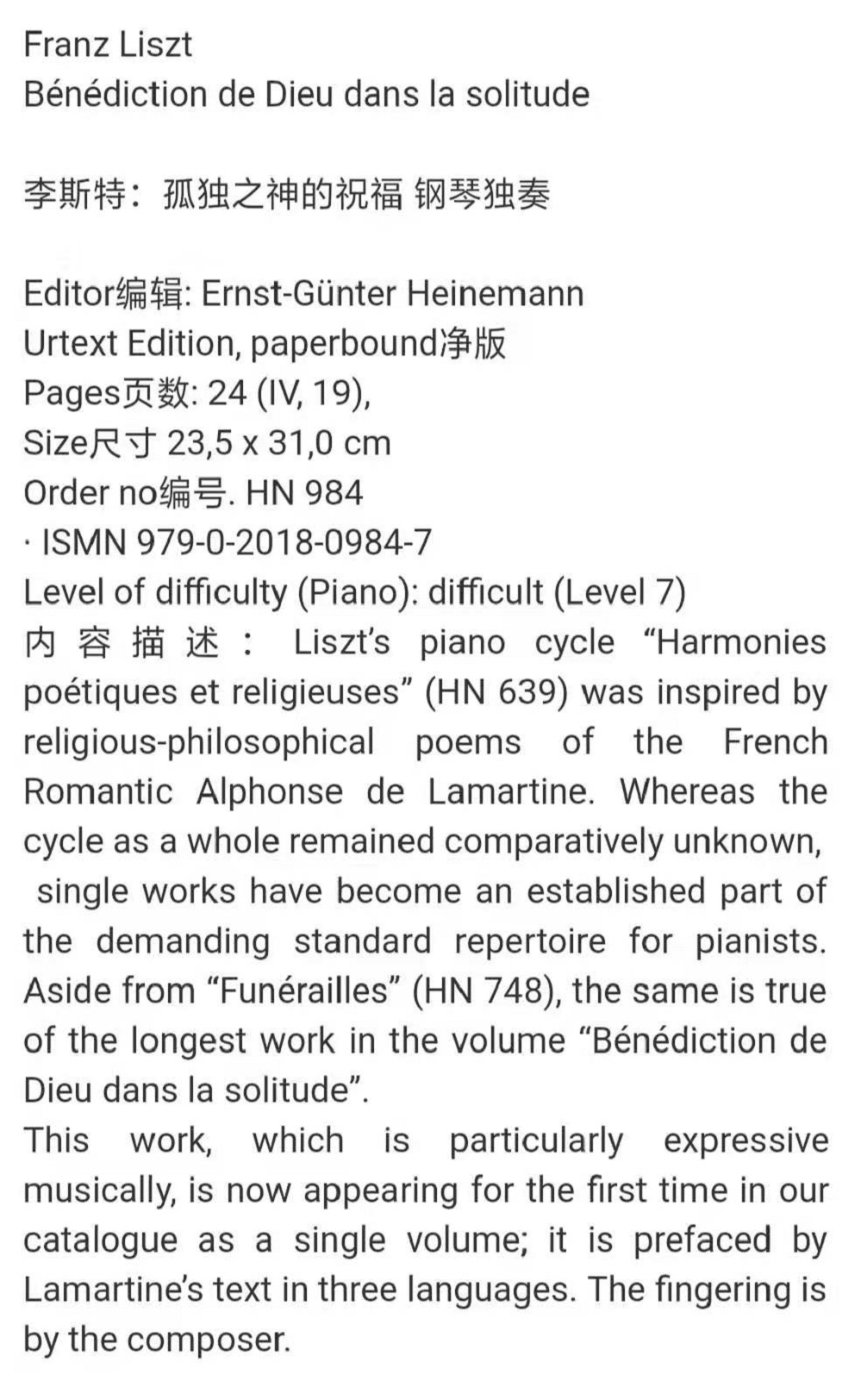 Liszt The Blessing of the Lonely God Piano Solo Henle Henle Original Score Book Liszt Benediction de Dieu dan