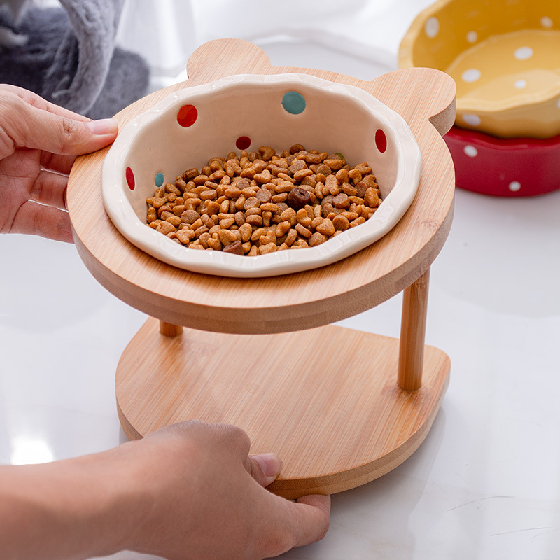 Meta Gas Meow -- Ceramic Cat Bowl Pitched Double Bowl Solid Wood Shelf Protection Cervical Spine Dog Bowl Pet Bowl Anti-Roll Adjustable