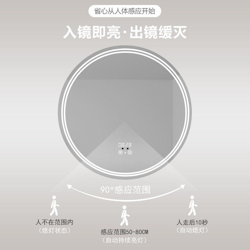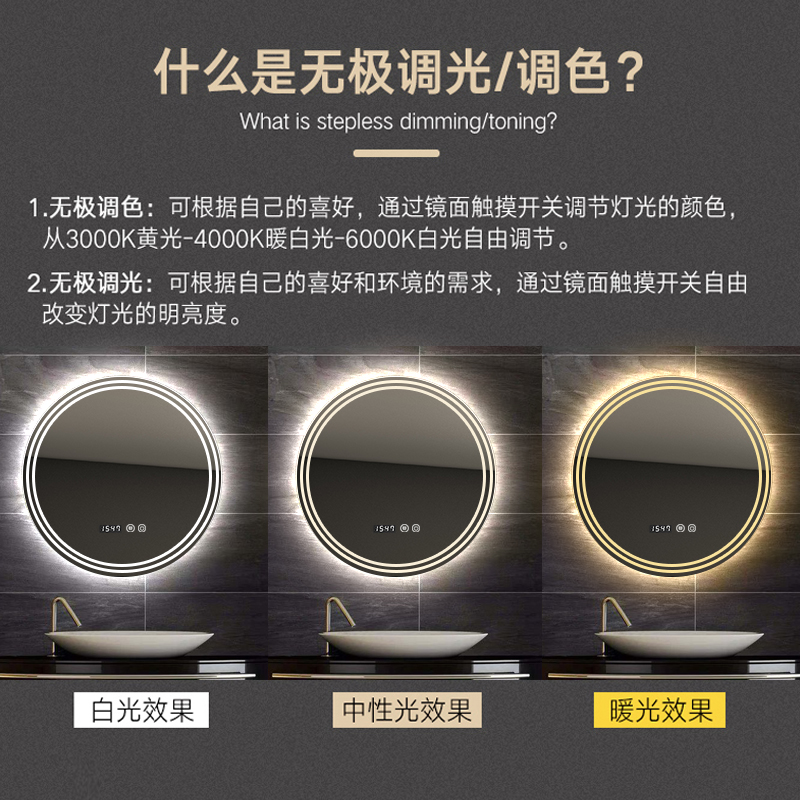 White light No touch anti-fog warm light No touch fog white light single touch anti-fog warm light single touch anti-fog white light double touch time temperature shows anti-fog warm light