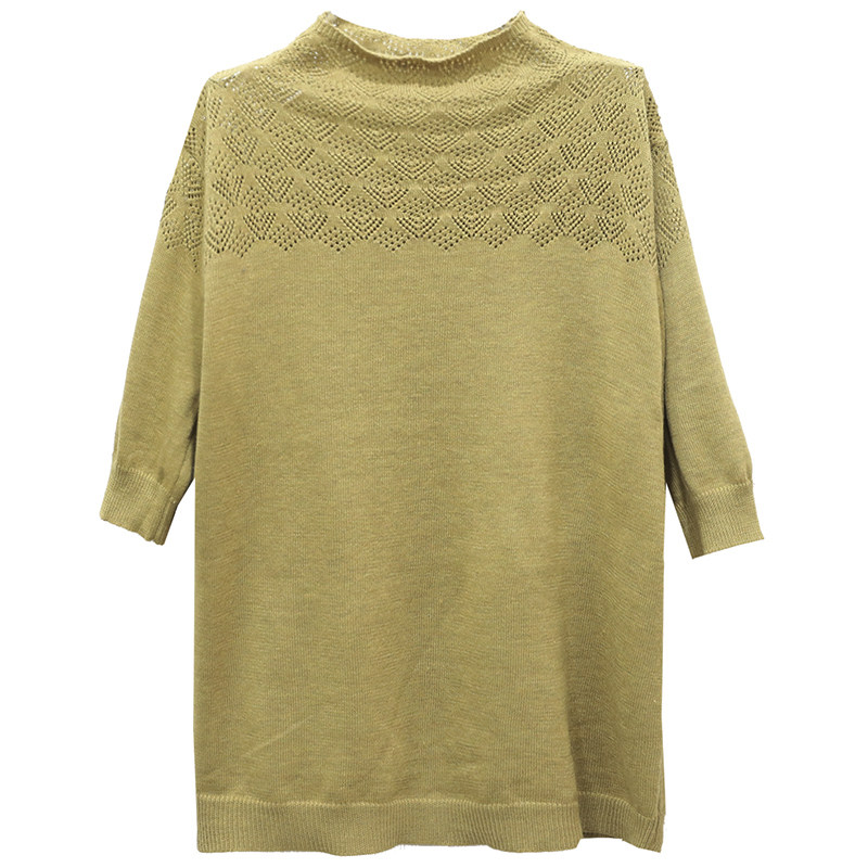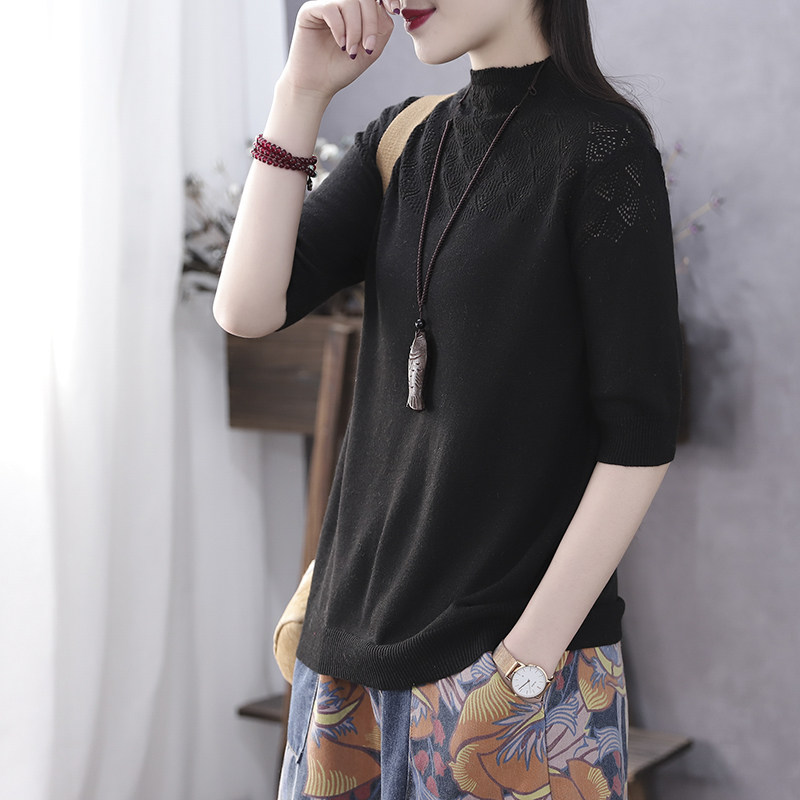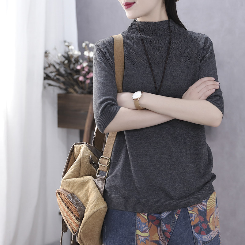 Han Soyi retro art early spring new 50% sleeves wool knitted sweatshirt woman high collar bottom shirt with thin hollowed-out blouse