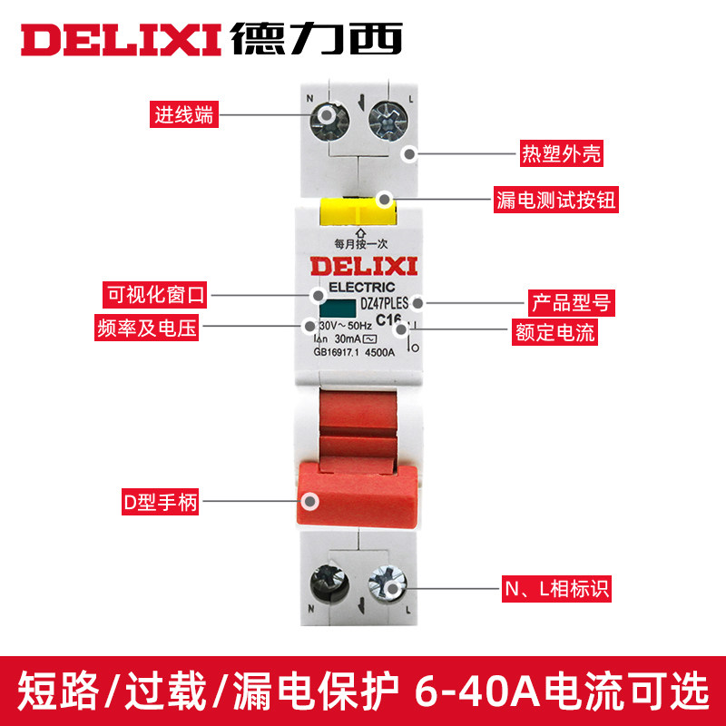 Delixi DZ47PLES double-in and double-out single-chip leakage electric shock protector household air switch 1P N leak protection