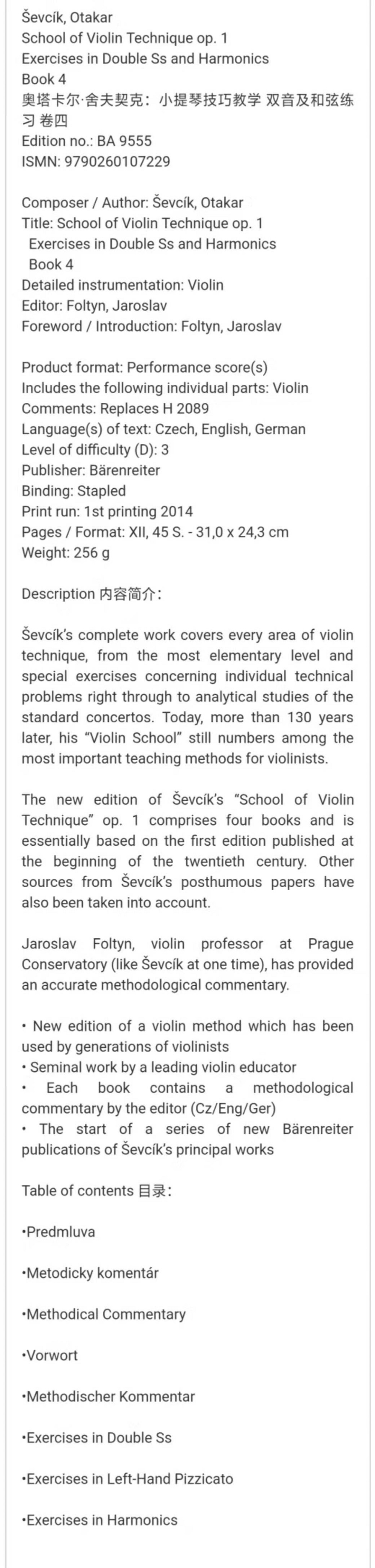 Shevchik Violin Technique Textbook op1 Volume 4 double tone and chord practice Riding Bear original sheet music Book Otakar Sevcik School o