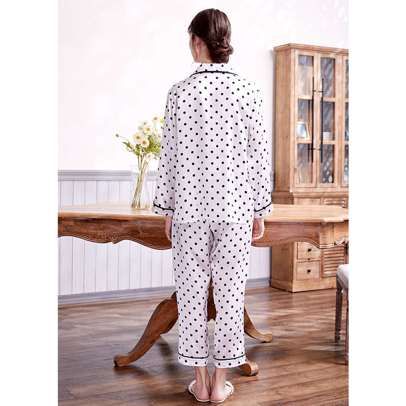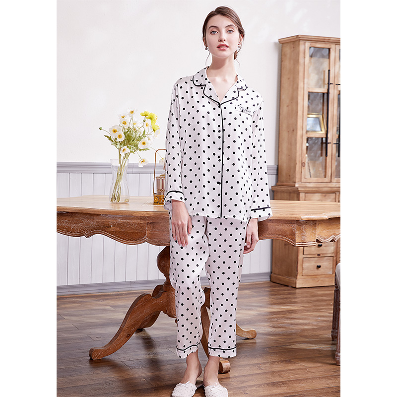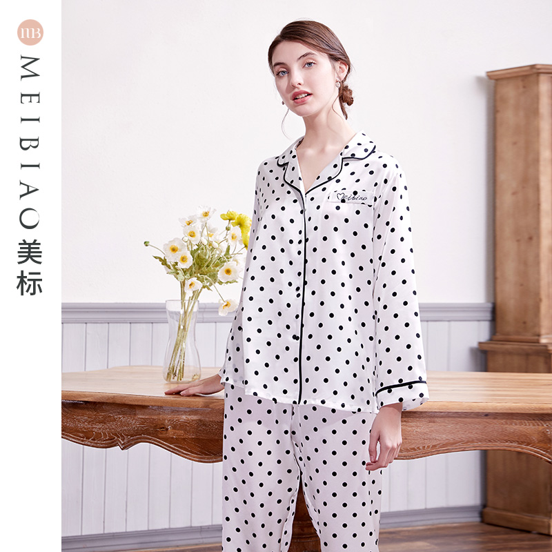 American Long sleeve silk pajama suit Women's spring and summer fashion wave dot inkjet 100% Mulberry silk silk home clothes Autumn
