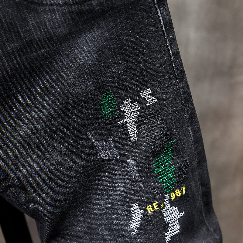 Fall Tide Card Breaking Hole Jeans Men's Body Smoke Tubes Pants Korean Version Trend 100 Hitch Printed Elastic Long Pants Man