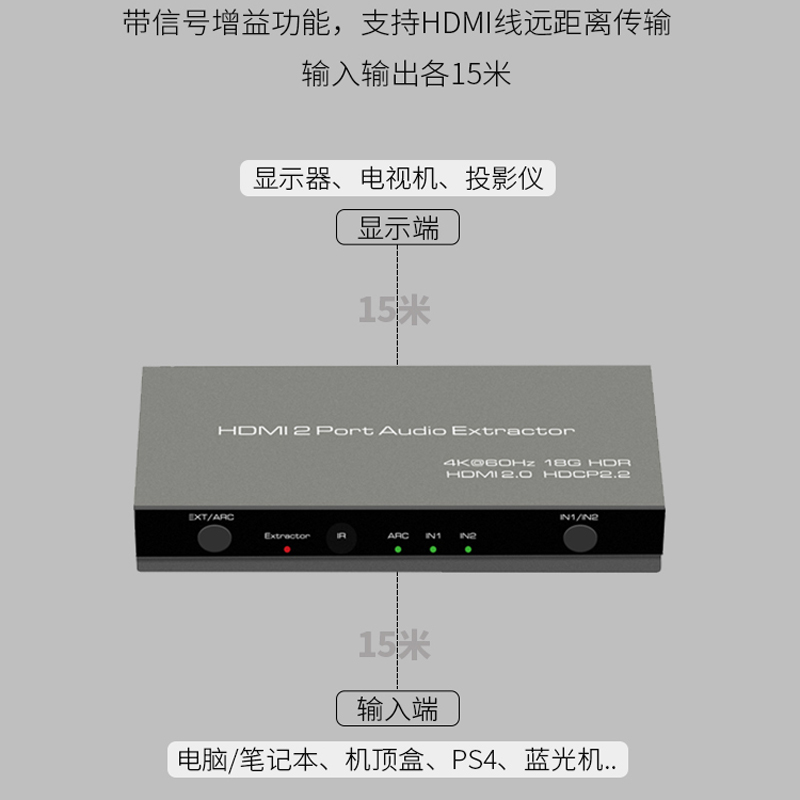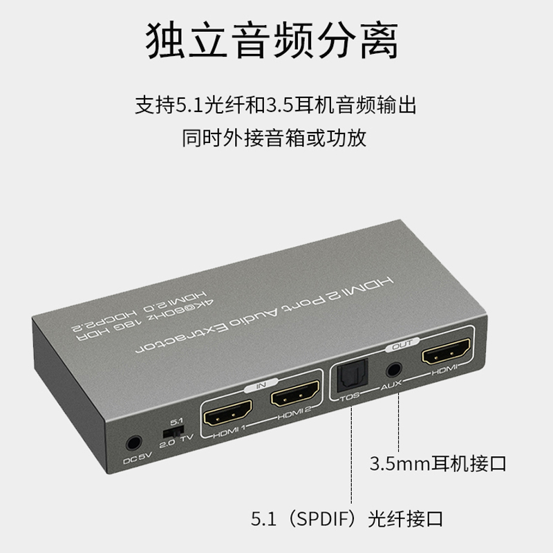 hdmi switcher 2 in 1 out with audio splitter 2 0 version 4K60HZ to optical fiber 5 1 audio 3 5 headphones