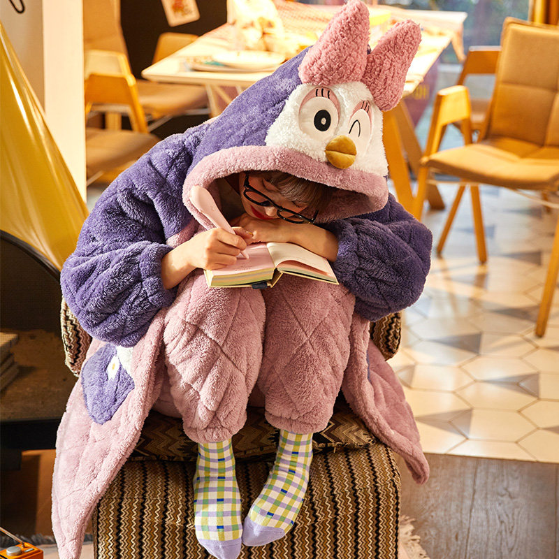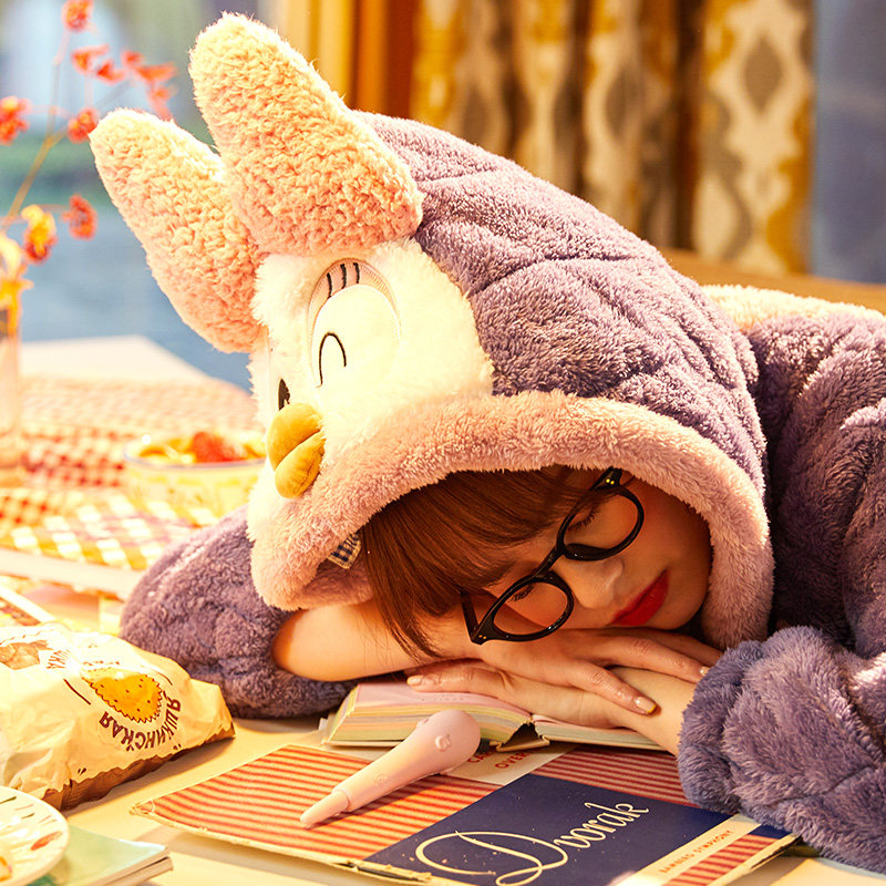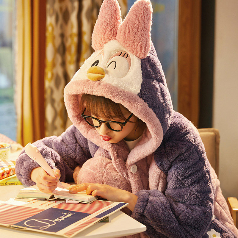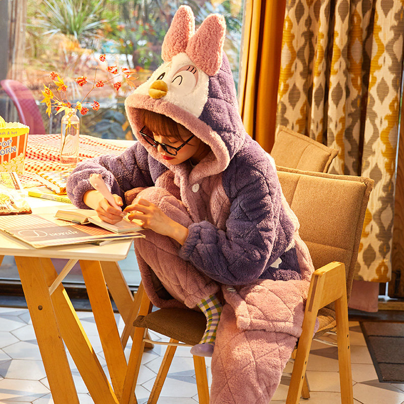 Coral velvet warm pajamas women's autumn and Winter cartoon thickened velvet winter three-layer padded flannel home suit set
