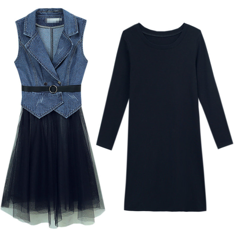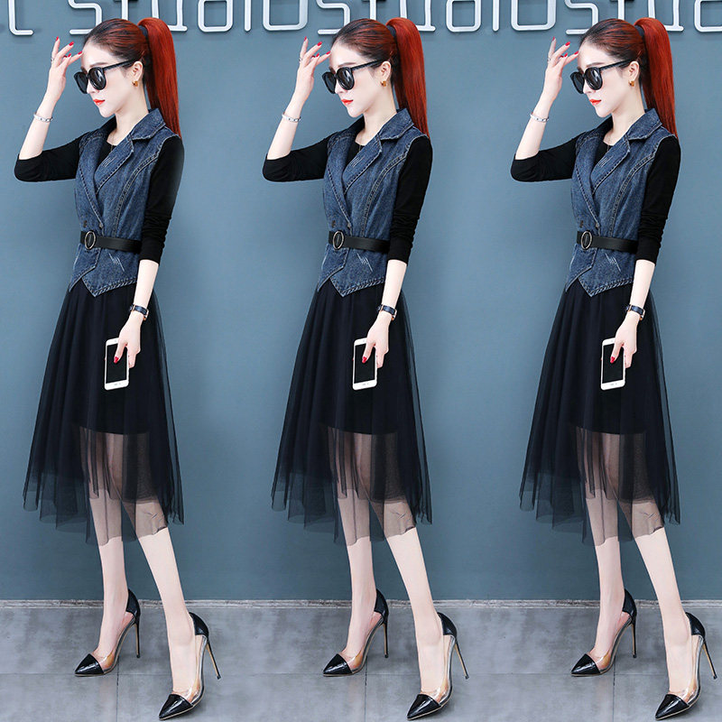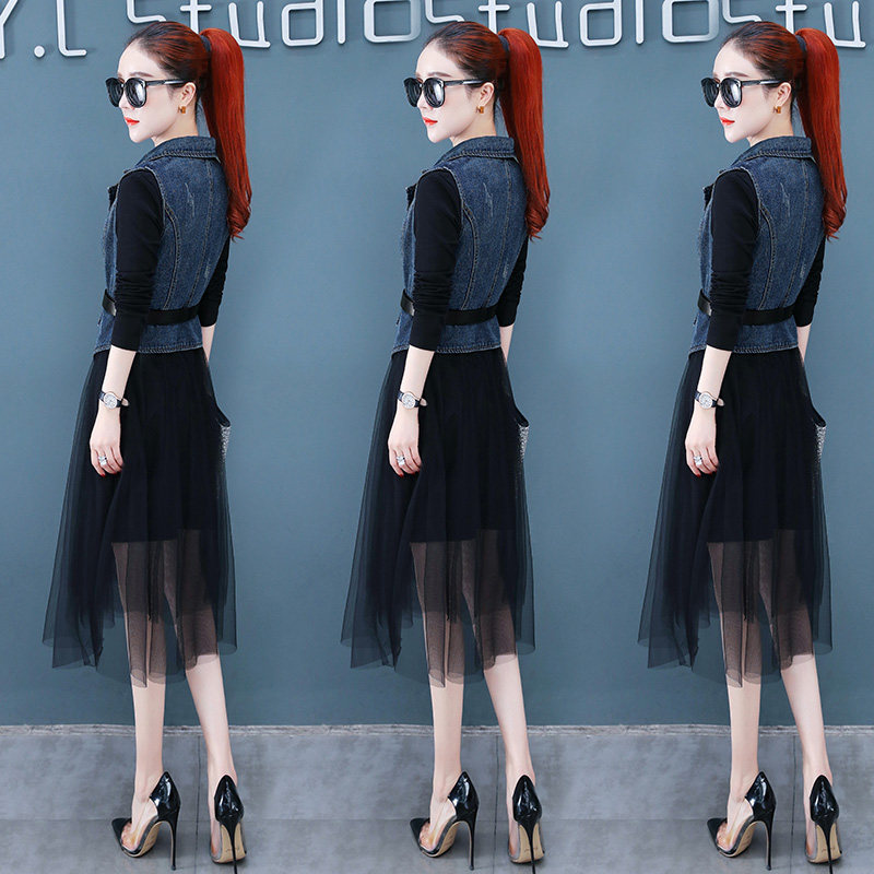 2021 new autumn dress denim temperament spring two-piece Taiwan small suit with yarn skirt light cooked