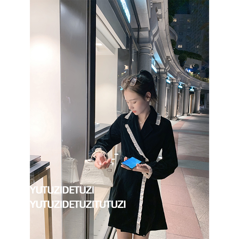 Fish Rabbit-French retro V-neck lantern sleeve small black dress female Hepburn wind small heart machine velvet dress