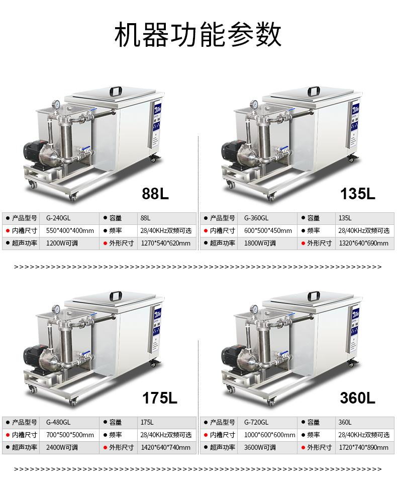 G-080S—22L Multifunction Cleaner G-100S—30L Multifunction Cleaner G-12A—38L Cleaning Standard G-180GL—61L Cycle Cleaning (Filter)High Edition G-240GL—88L Cycle Cleaning (Filtering)High Edition G-300GL—108L Circulating Cleaning (Filtering)High-End Edition G-360GL—135L Cyclic Cleaning (Filtering)High-End Edition G-480GL—175L Cyclic Cleaning (Filtering) High-End Edition G-720GL— 360L Cycle Cleaning (Filtration) High Edition G-2012GH Cycle Cleaning (Filtration) + Drying Machine Deluxe Edition G-2018GH Cycle Cleaning (Filtration) + Dryer Deluxe Edition G-2030GH Cycle Cleaning (Filtration) + Dryer Deluxe Edition G-2036GH Cycle Cleaning (Filtration) + Drying Machine Deluxe Edition G-2060GH Cycle Cleaning (Filtration) + Dryer Deluxe Edition G-2072GH Cycle Cleaning (Filtration) + Drying All-in-One Machine Deluxe Edition G-2072GH Cycle Cleaning (Filtration) + Drying All-in-One Machine Deluxe Edition G-3012GH Cycle Cleaning (Filtration) + Dryer Deluxe Edition G-3018GH Cycle Cleaning (Filtration) + Dryer Deluxe Edition G-3030GH Cycle Cleaning (Filtration) + Drying Machine Deluxe Edition G-3036GH Cycle Cleaning (Filtration) + Dryer Deluxe Edition G-3060GH Cycle Cleaning (Filtration) + Dryer Deluxe Edition G-3072GH Cycle Cleaning (Filtration) + Dryer Deluxe Edition DL-3100 10L Small Deluxe Model G-060S 15L G-040S 10L