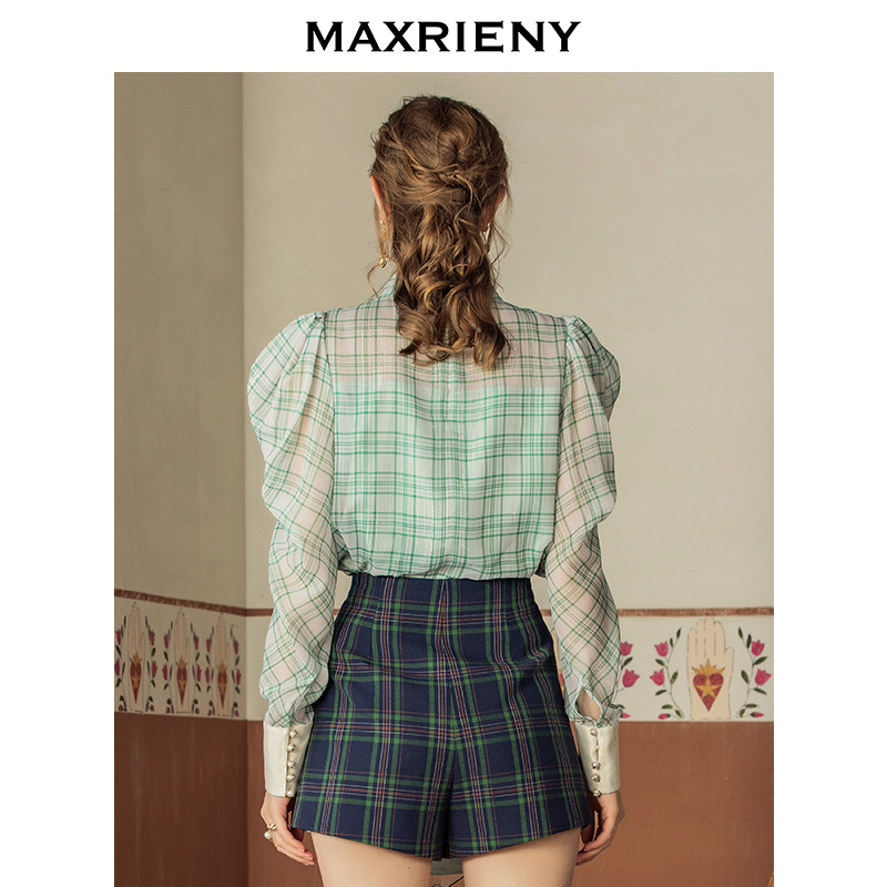 MAXRIENY2020 spring fashion retro embroidered PLAID lamb leg sleeve round neck shirt women's long-sleeved short top women