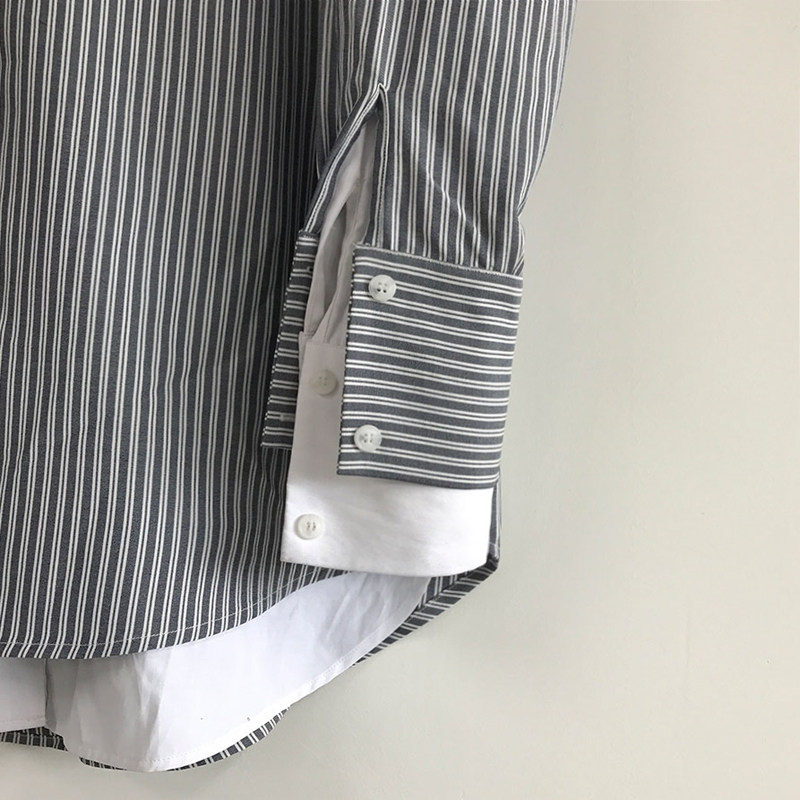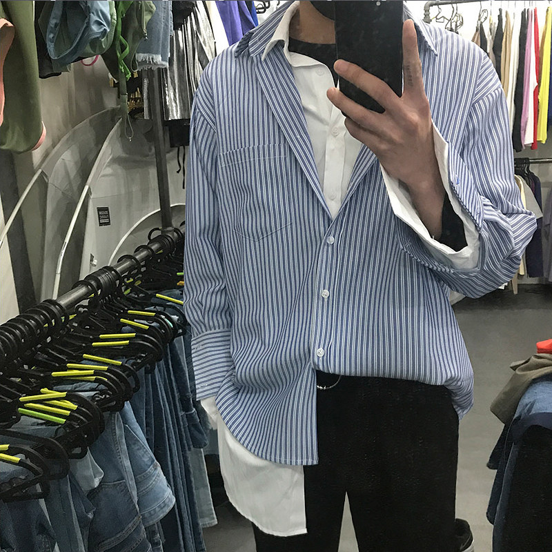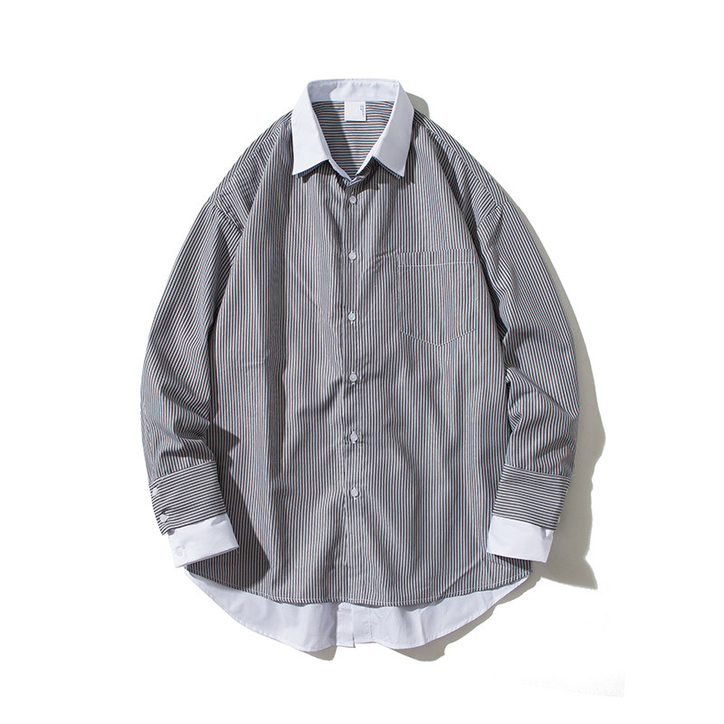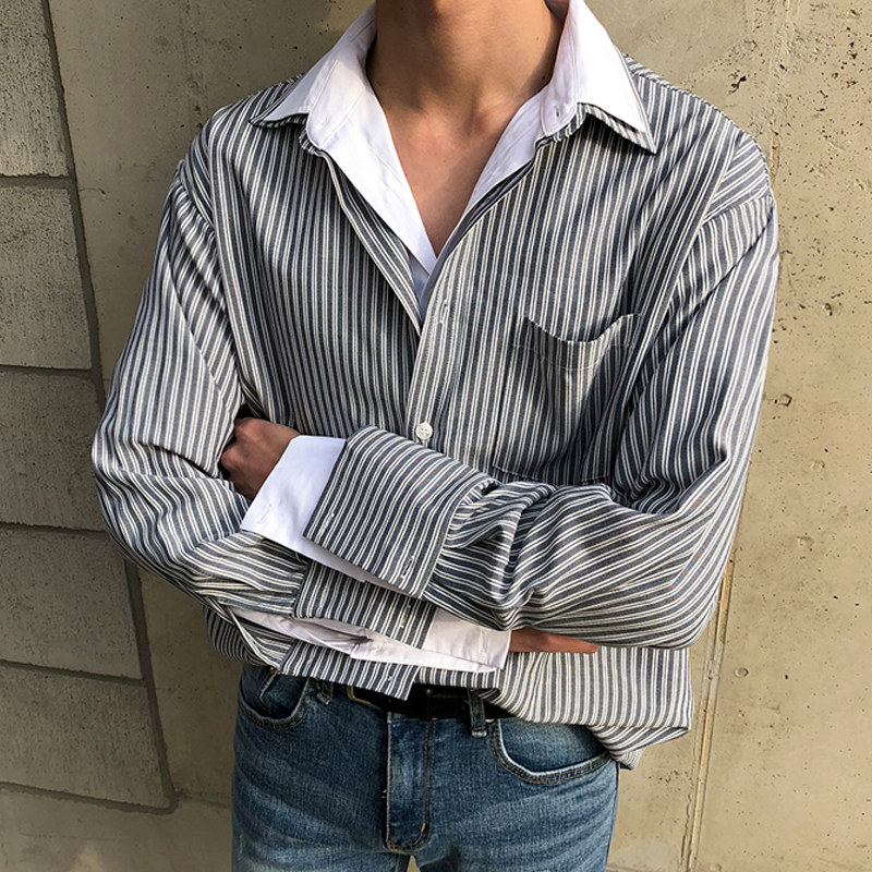 Korean version of loose fake two-piece striped shirt men's trendy spring and autumn lazy style long-sleeved trendy shirt Hong Kong style handsome one-inch shirt