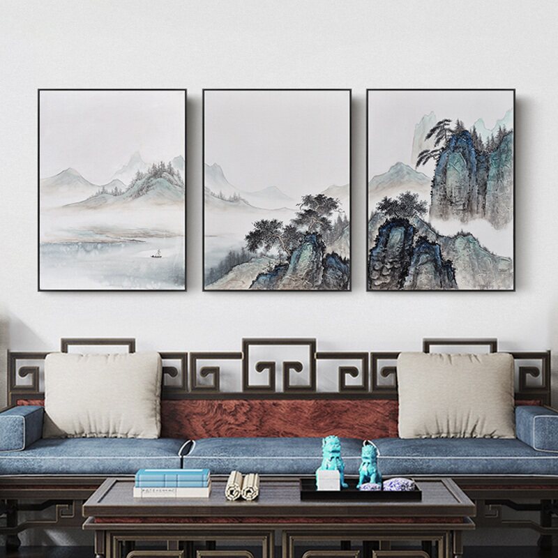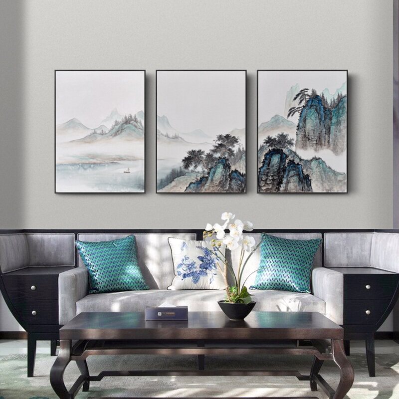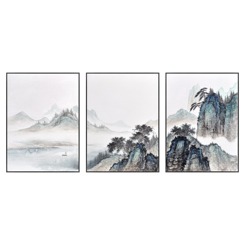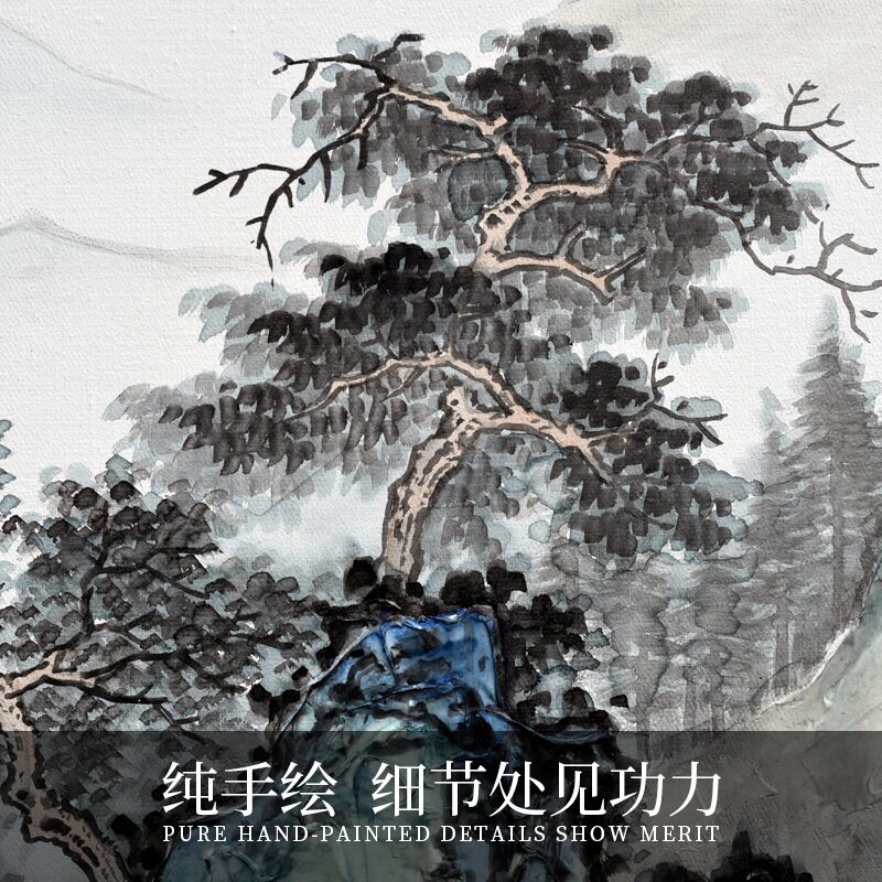 Modern New Chinese Mountain Sichuan Greeting Guest Pine Pure Hand Painted Musicure Water Ink Landscape Painting Sofa Living Room Decoration Painting Triptych