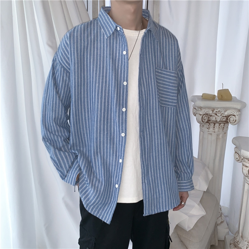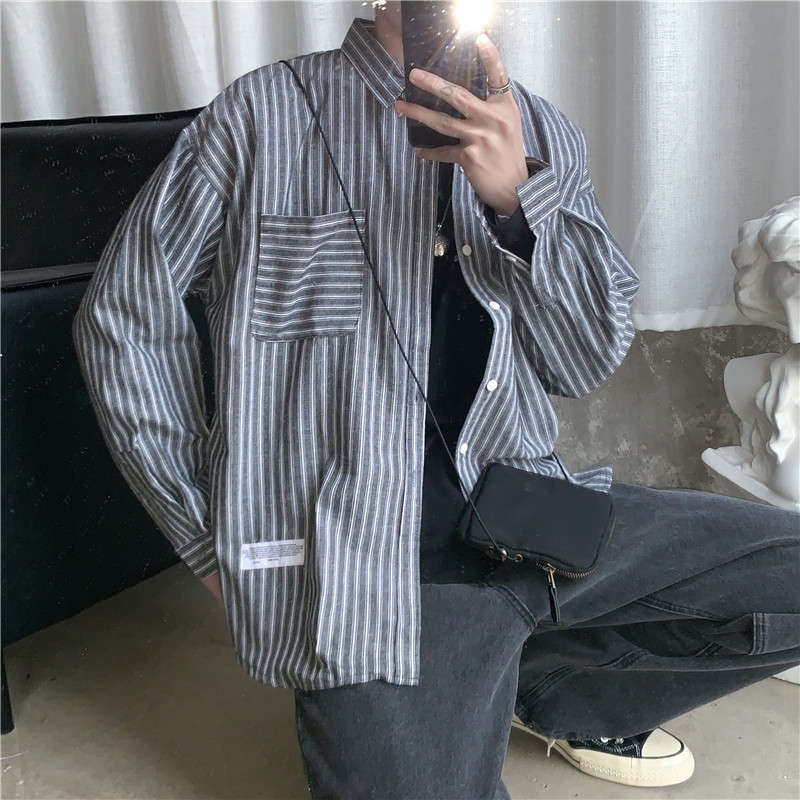 Shirt men's spring new ins trend handsome casual long-sleeved shirt men's lapel port wind striped jacket trend