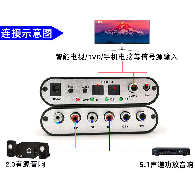 Fiber coaxial 3 5 turn 5 1 channel decoder optical fiber coaxial 3 5 HDMIARC turn 5 1 decode 5 1 channel decoder with USB Bluetooth Play computer DV