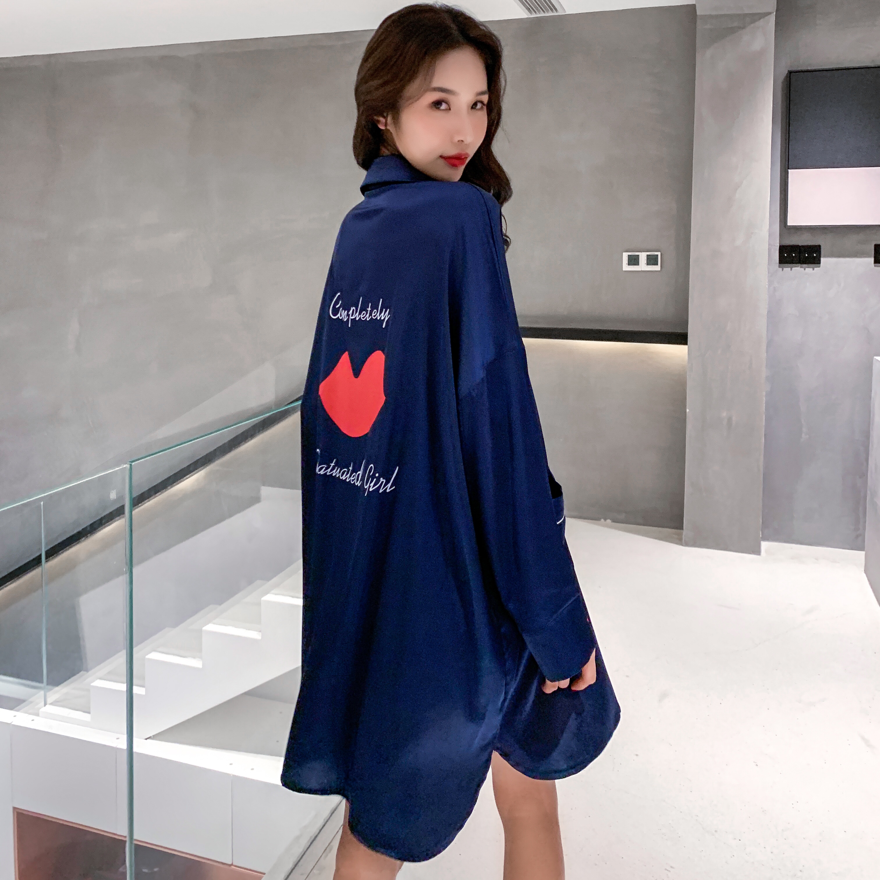 Shirt Ice Silk Sleeping Dress Lady Spring Summer Long Sleeves Silk Slippery Comfort Red Lips Sexy Boyfriend Wind Long Version Pyjamas Clothing Home Clothes