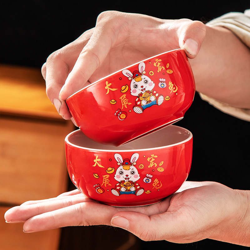 Rabbit New Year festive bowl New Year bowl Spring Festival annual event gift red bowl chopsticks set cute rabbit bowl tableware