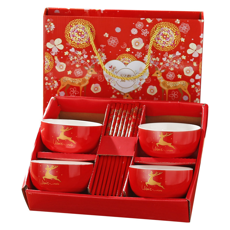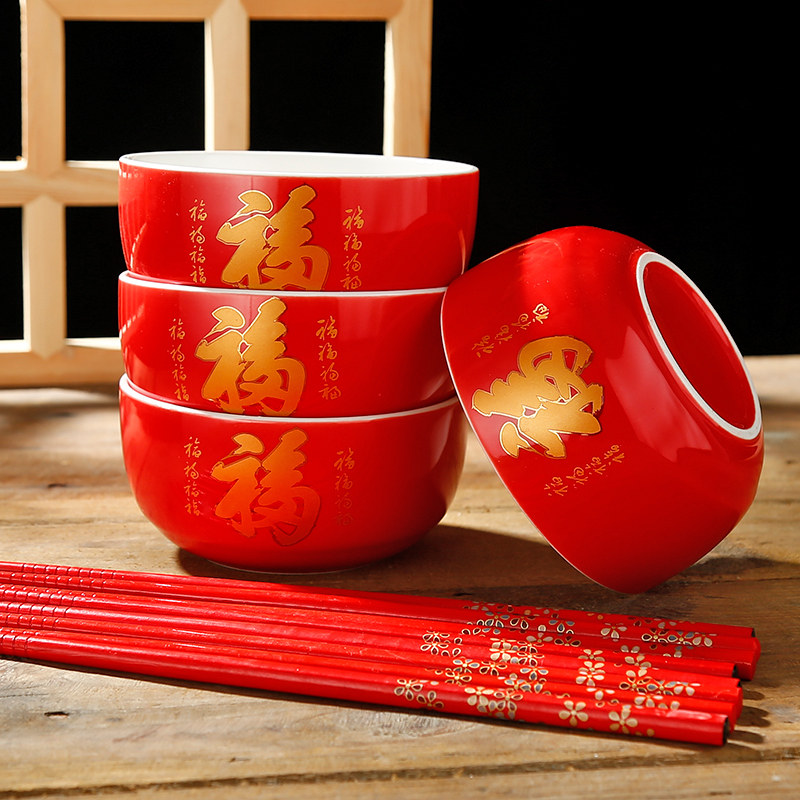 Fu character bowl 4 bowls 4 (red chopsticks) gift box