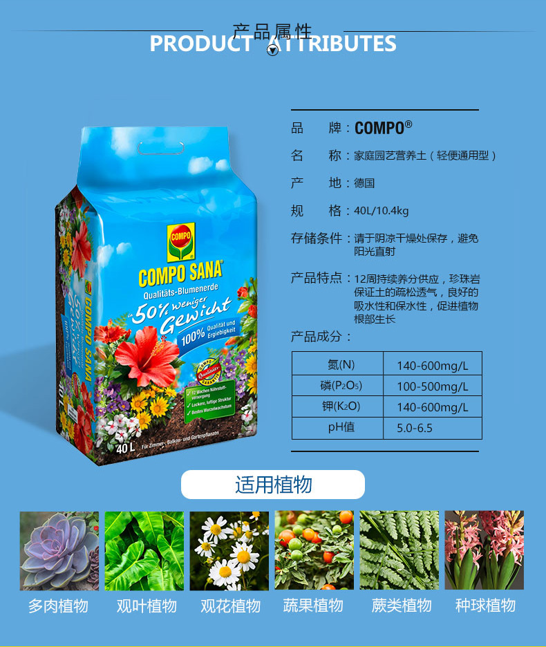 COMPO Germany imported general-purpose large bag of peat light home gardening potted planting nutrient soil 40L