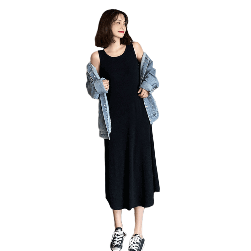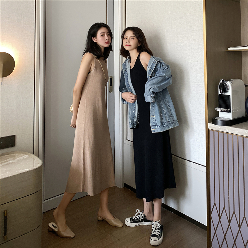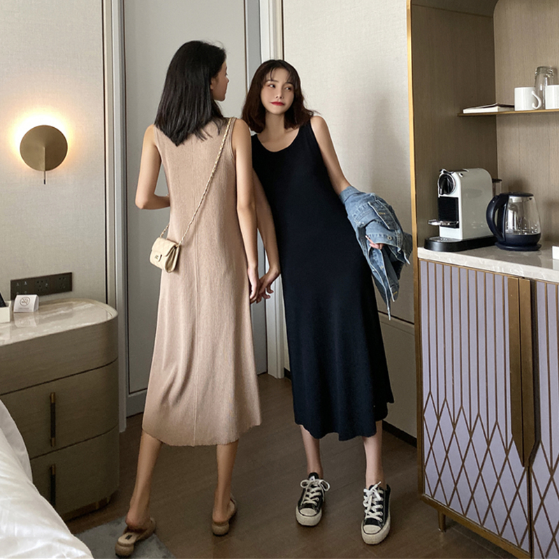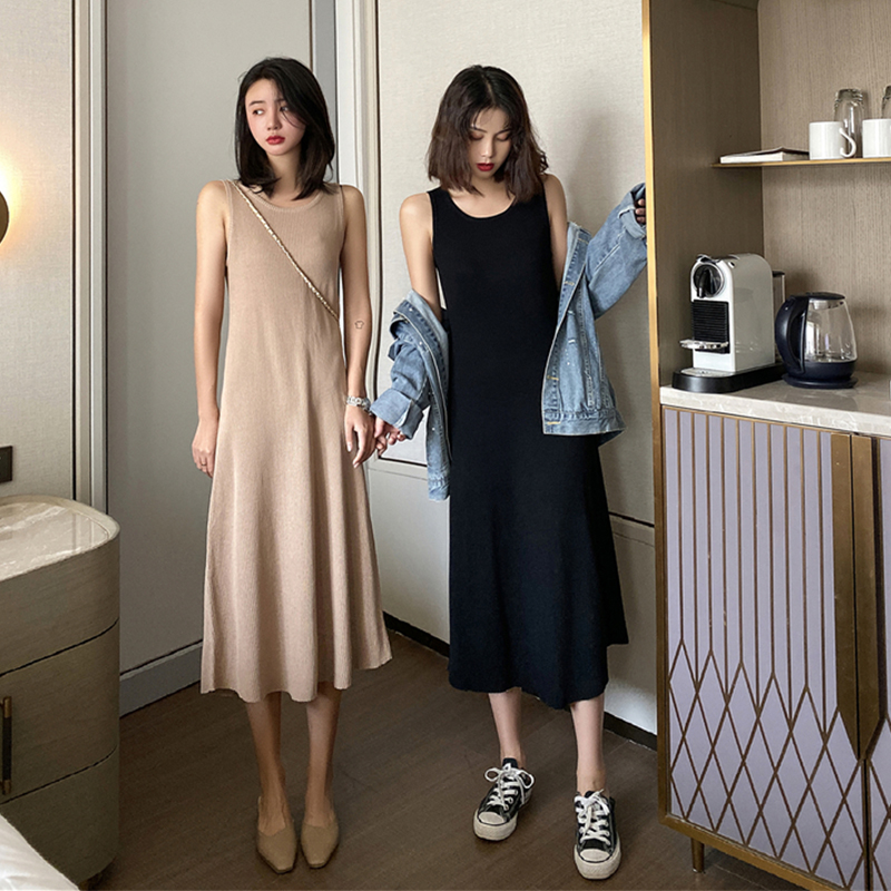 Dress, feminine temperament, long version, baby bag skirt, knitted inner long skirt, vest, summer skirt, black small suspender - Taobao