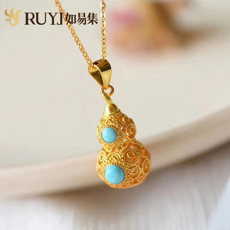 Ancient Wind Earrings Woman Earrings Pendant China Wind Classical Super Fairy Small Gourd Earrings Pure Silver Natural Green Pine Stone Collarbone Necklace