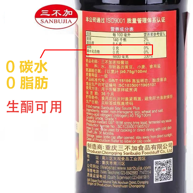 Three sugar-free soy sauce 500ml ketogenic zero 0 carbohydrate 0 fat braised condiment without additives