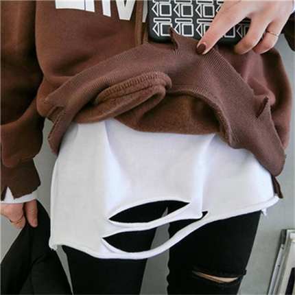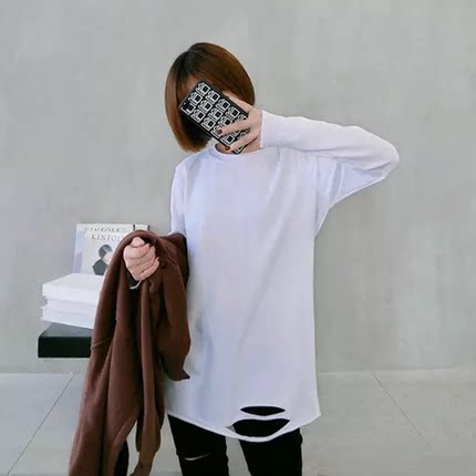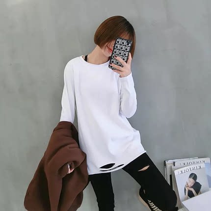 2021 spring and autumn new white hole long-sleeved T-shirt women's long version of the Korean version of thin loose base shirt top tide
